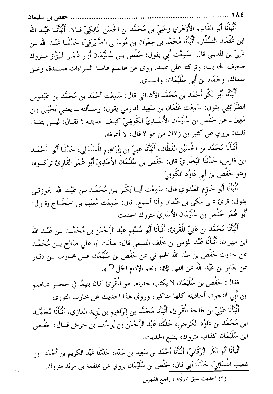 أنبأنا محمّد بن الحسين القطّان، أنبأنا عليّ بن إبراهيم المستملي، حدّثنا أبو أحمد ابن فارس، حَدَّثَنَا الْبُخَارِيّ قَالَ: حفص بْن سُلَيْمَان الأسدي أَبُو عُمَر القارئ تركوه، وَهُوَ حفص بْن أبي داود الكوفيّ.