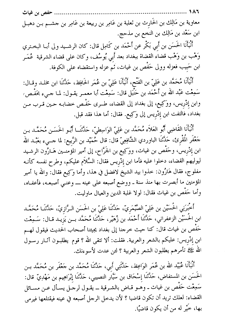أَنْبَأَنَا الْقَاضِي أَبُو الْعَلاءِ مُحَمَّدُ بْنُ عَلِيِّ الواسطي، حَدَّثَنَا أَبُو الْحَسَن مُحَمَّد بْن جَعْفَر المقرئ، حَدَّثَنَا الباوردي الشَّافِعِيّ قَالَ: قَالَ حميد بْن الرّبيع: لما جيء بعبد الله ابن إدريس، وَحفص بْن غياث، وَوكيع بْن الجراح، إِلَى أمير المؤمنين هارون الرشيد ليوليهم القضاء، دخلوا عَلَيْهِ فأما ابْن إدريس فَقَالَ: السلام عليكم، وَطرح نفسه كأنه مفلوج، فَقَالَ هارون: خذوا بيد الشيخ لا فضل فِي هذا، وَأما وَكيع فَقَالَ: وَالله يا أمير المؤمنين ما أبصرت بها منذ سنة- وَوضع أصبعه على عينه- وَعنى أصبعه، فأعفاه، وَأما حفص بْن غياث فَقَالَ: لولا غلبة الدين وَالعيال ما وليت.