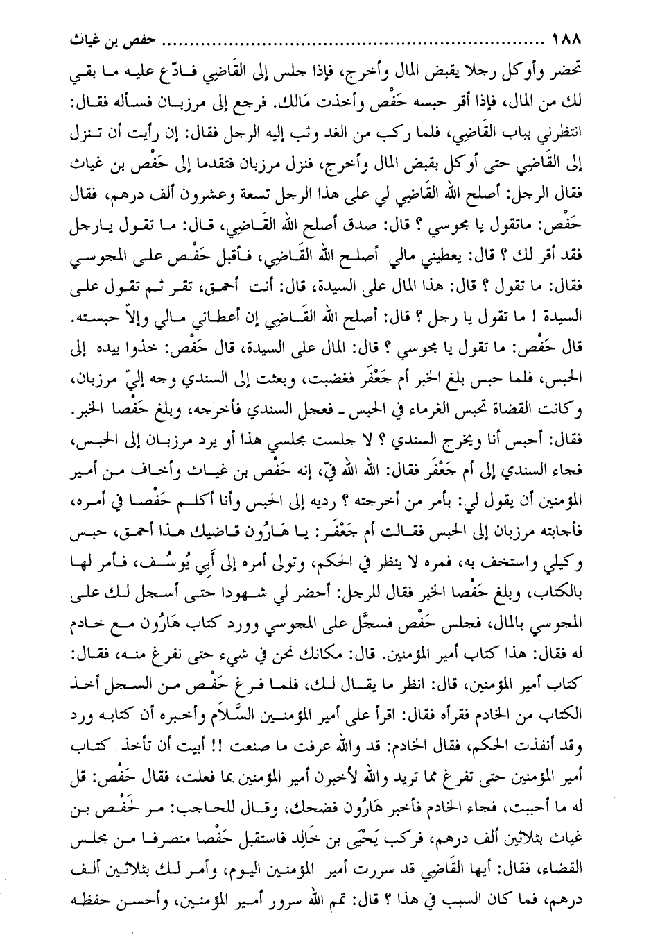 فَقَالَ: أحبس أنا وَيخرج السندي؟ لا جلست مجلسي هذا أَوْ يرد مرزبان إِلَى الحبس، فجاء السندي إِلَى أم جَعْفَر فَقَالَ: اللَّه اللَّه فِي، إنه حفص بْن غياث وَأخاف من أمير المؤمنين أن يقول لي: بأمر من أخرجته؟ رديه إِلَى الحبس وَأنا أكلم حفصا في أمره، فأجابته مرزبان إِلَى الحبس فقالت أم جَعْفَر: يا هارون قاضيك هذا أحمق، حبس وَكيلي وَاستخف به، فمره لا ينظر فِي الحكم، وَتولي أمره إِلَى أَبِي يوسف، فأمر لها بالكتاب، وَبلغ حفصا الخبر فَقَالَ للرجل: احضر لي شهودا حتى أسجل لك على المجوسي بالمال، فجلس حفص فسجل على المجوسي وَورد كتاب هارون مَعَ خادم له فَقَالَ: هذا كتاب أمير المؤمنين. قَالَ: مكانك نحن فِي شيء حتى نفرغ منه، فَقَالَ: