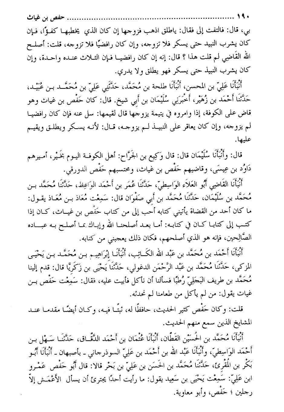 أنبأنا عليّ بن المحسن، أنبأنا طلحة بن محمّد، حدّثني عليّ بن محمّد بن عبيد، حدّثنا أحمد بن زهير، أَخْبَرَنِي سُلَيْمَان بْن أَبِي شيخ. قَالَ: كَانَ حفص بْن غياث وَهُوَ قاض على الكوفة، إذا يؤامروه فِي يتيمة يزوجها قَالَ لقيمها: سل عنه فإن كَانَ رافضيا لم يزوجه، وَإن كَانَ يعاقر على النبيذ لم يزوجه، قَالَ: لأنه يسكر ويطلق ويقيم عليها.