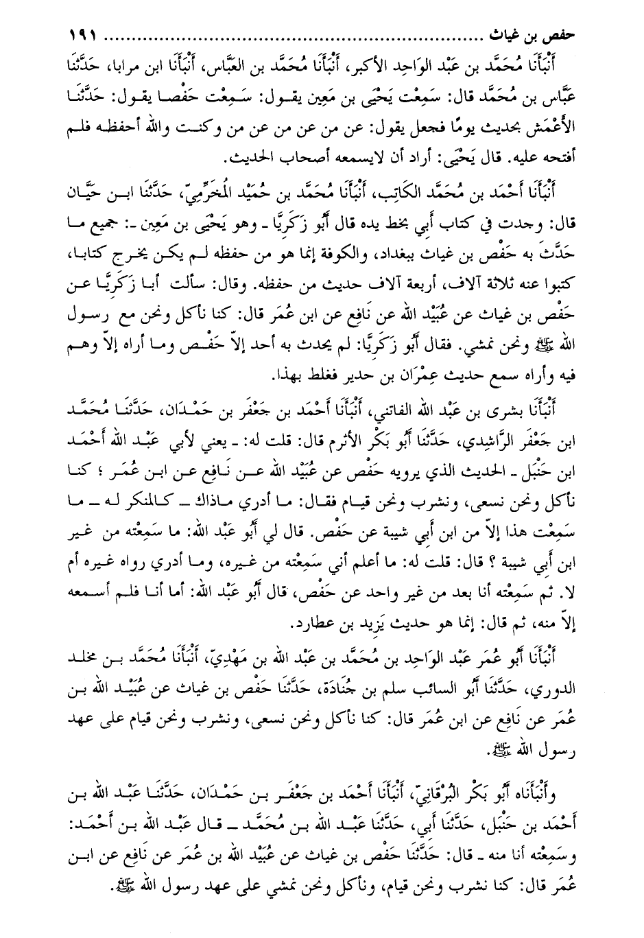 أَنْبَأَنَا أَحْمَدُ بْنُ محمّد الكاتب، أنبأنا محمّد بن حميد المخرّميّ، حدّثنا ابن حيان قَالَ: وجدت فِي كتاب أَبِي بخط يَدِهِ قَالَ أَبُو زَكَرِيَّا- وَهُوَ يَحْيَى بْنُ مَعِينٍ-: جَمِيعُ مَا حَدَّثَ بِهِ حَفْصُ بْنُ غِيَاثٍ بِبَغْدَادَ، وَالْكُوفَةِ إِنَّمَا هُوَ مِنْ حِفْظِهِ لم يكن يخرج كتابا، كتبوا عنه ثلاثة آلاف، أَرْبَعَةَ آلافِ حَدِيثٍ مِنْ حِفْظِهِ. وَقَالَ: سَأَلْتُ أَبَا زَكَرِيَّا عَن حَفْصُ بْنُ غَيَّاثٍ عَنْ عُبَيْدِ اللَّهِ عَنْ نَافِعٍ عَنِ ابْنِ عمر قَالَ: كُنَّا نَأْكُلُ ونَحْنُ مَعَ رَسُولِ اللَّهِ صَلَّى اللَّهُ عَلَيْهِ وَسَلَّمَ وَنَحْنُ نَمْشِي. فَقَالَ أَبُو زَكَرِيَّا: لَمْ يُحَدِّثْ بِهِ أَحَدٌ إِلا حَفْصٌ وَمَا أَرَاهُ إِلا وَهِمَ فِيهِ وَأَرَاهُ سَمِعَ حَدِيثَ عِمْرَانَ بْنِ حُدَيْرٍ فَغَلِطَ بِهَذَا.