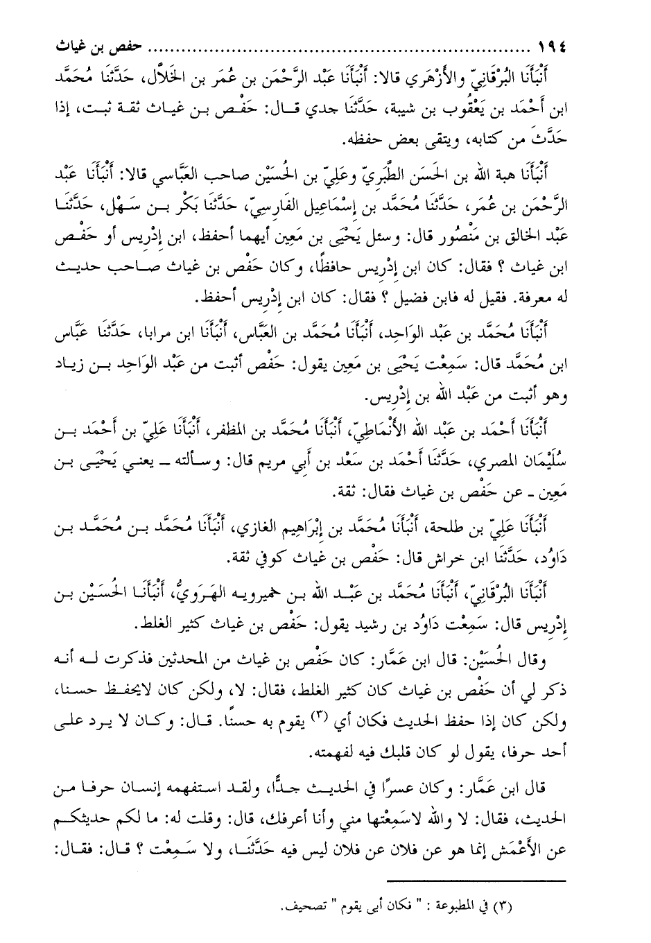 أنبأنا البرقانيّ والأزهري قالا: أنبأنا عبد الرّحمن بن عمر بن الخلّال، حَدَّثَنَا محمد ابن أحمد بن يعقوب بن شيبة، حَدَّثَنَا جدي قَالَ: حفص بْن غياث ثقة ثبت، إذا حدث من كتابه، وَيتقى بعض حفظه.