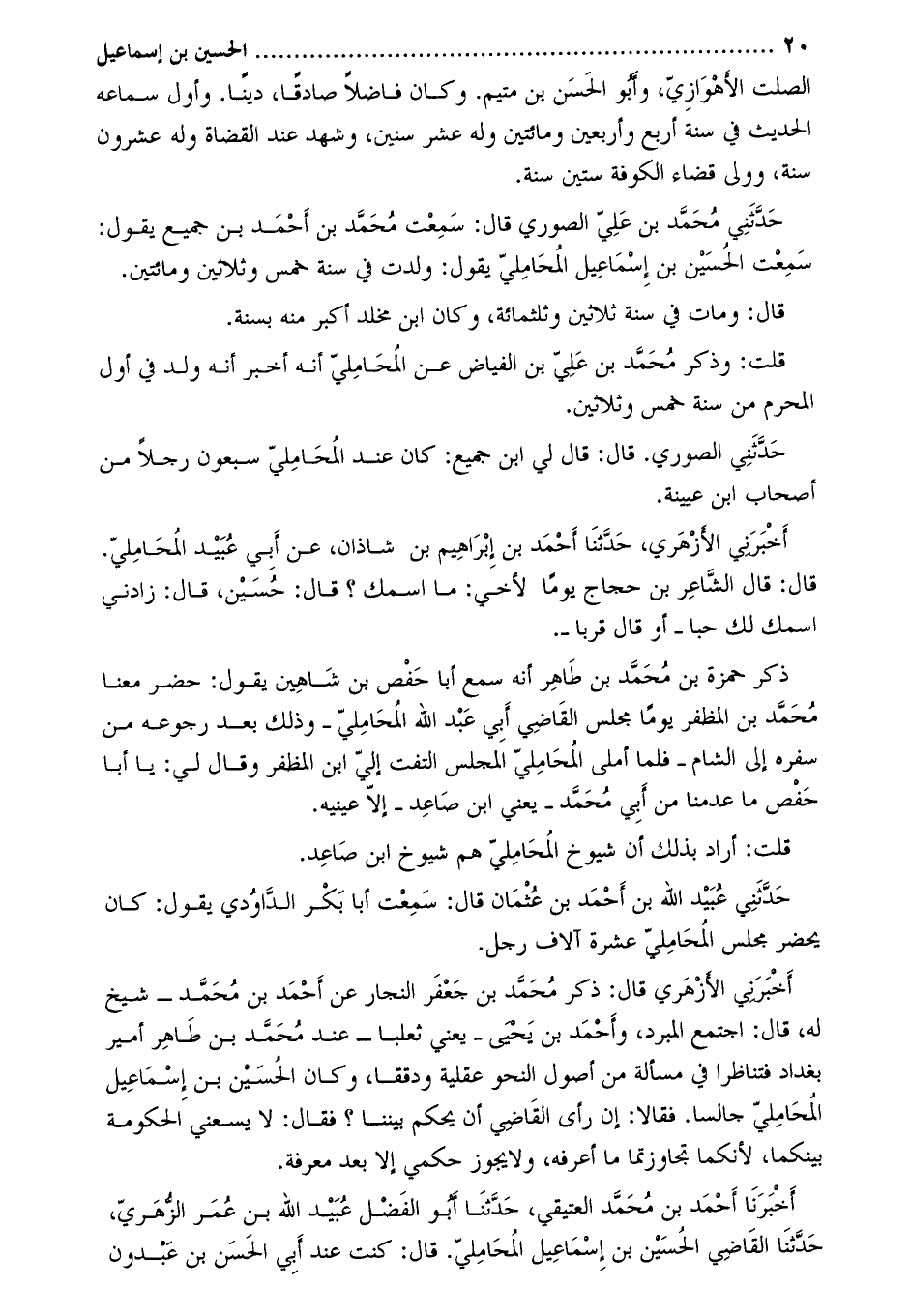 أَخْبَرَنَا أَحْمَدُ بْنُ محمّد العتيقي، حدّثنا أبو الفضل عبيد الله بن عمر الزّهريّ، حَدَّثَنَا الْقَاضِي الْحُسَيْنُ بْنُ إِسْمَاعِيلَ الْمَحَامِلِيُّ. قَالَ: كُنْتُ عِنْدَ أَبِي الْحَسَنِ بْنِ عَبْدُونَ