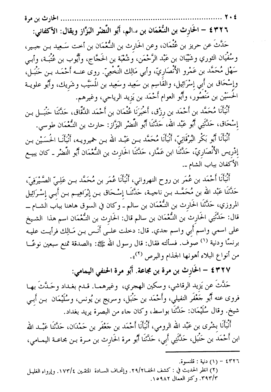 أنبأنا بشرى بن عبد الله الرومي، أنبأنا أحمد بن جعفر بن حمدان، حَدَّثَنَا عبد الله ابن أحمد بن حنبل، حدّثني أبي، حَدَّثَنَا أَبُو مُرَّةَ الْحَارِثُ بْنُ مُرَّةَ بْنِ مجاعة اليمامي،
