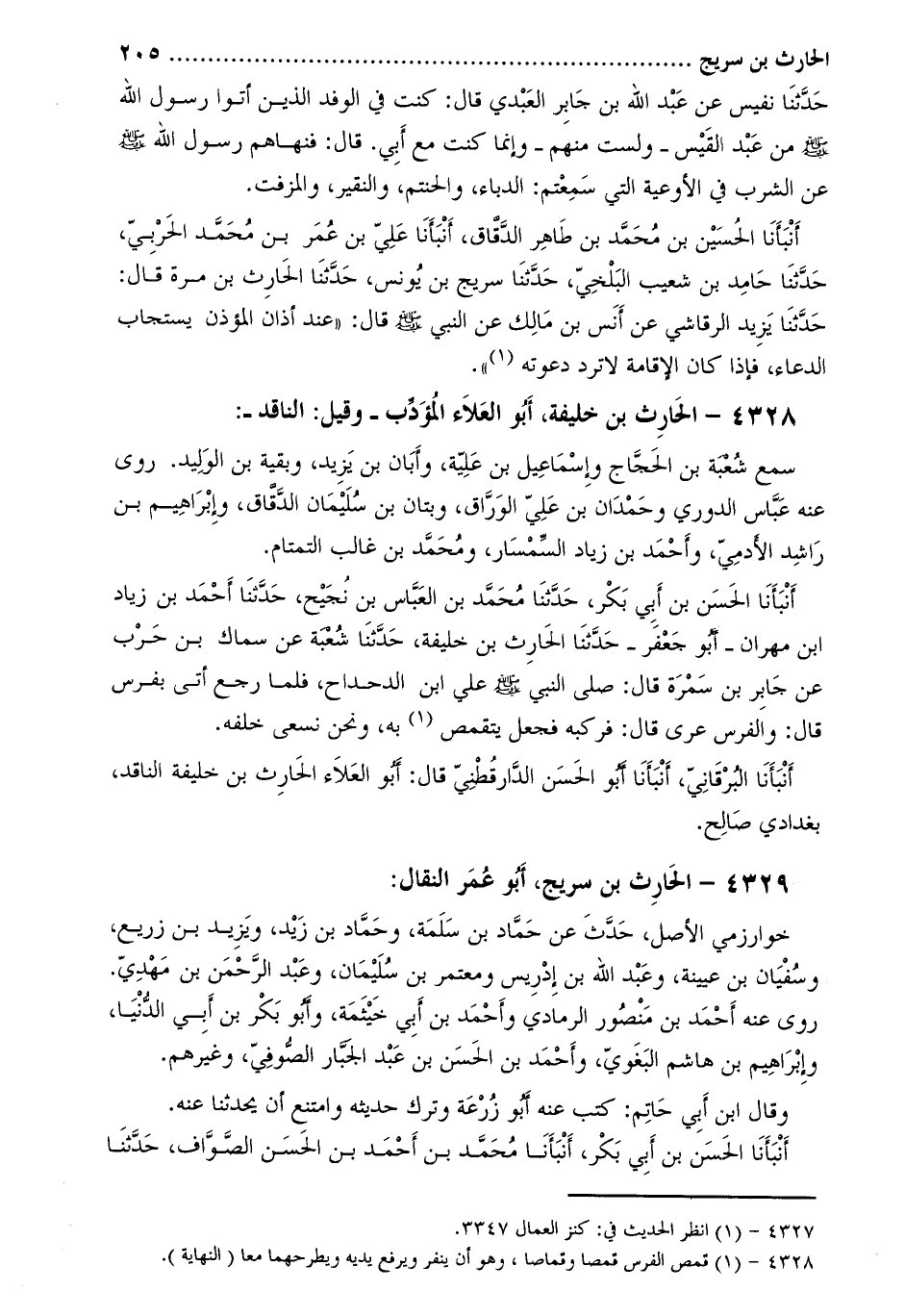 أنبأنا الحسين بن محمّد بن طاهر الدّقّاق، أنبأنا عَلِيُّ بْنُ عُمَرَ بْنِ مُحَمَّدٍ الْحَرْبِيِّ، حَدَّثَنَا حامد بن شعيب البلخيّ، حدّثنا سريج بن يونس، حَدَّثَنَا الْحَارِثُ بْنُ مُرَّةَ قَالَ: