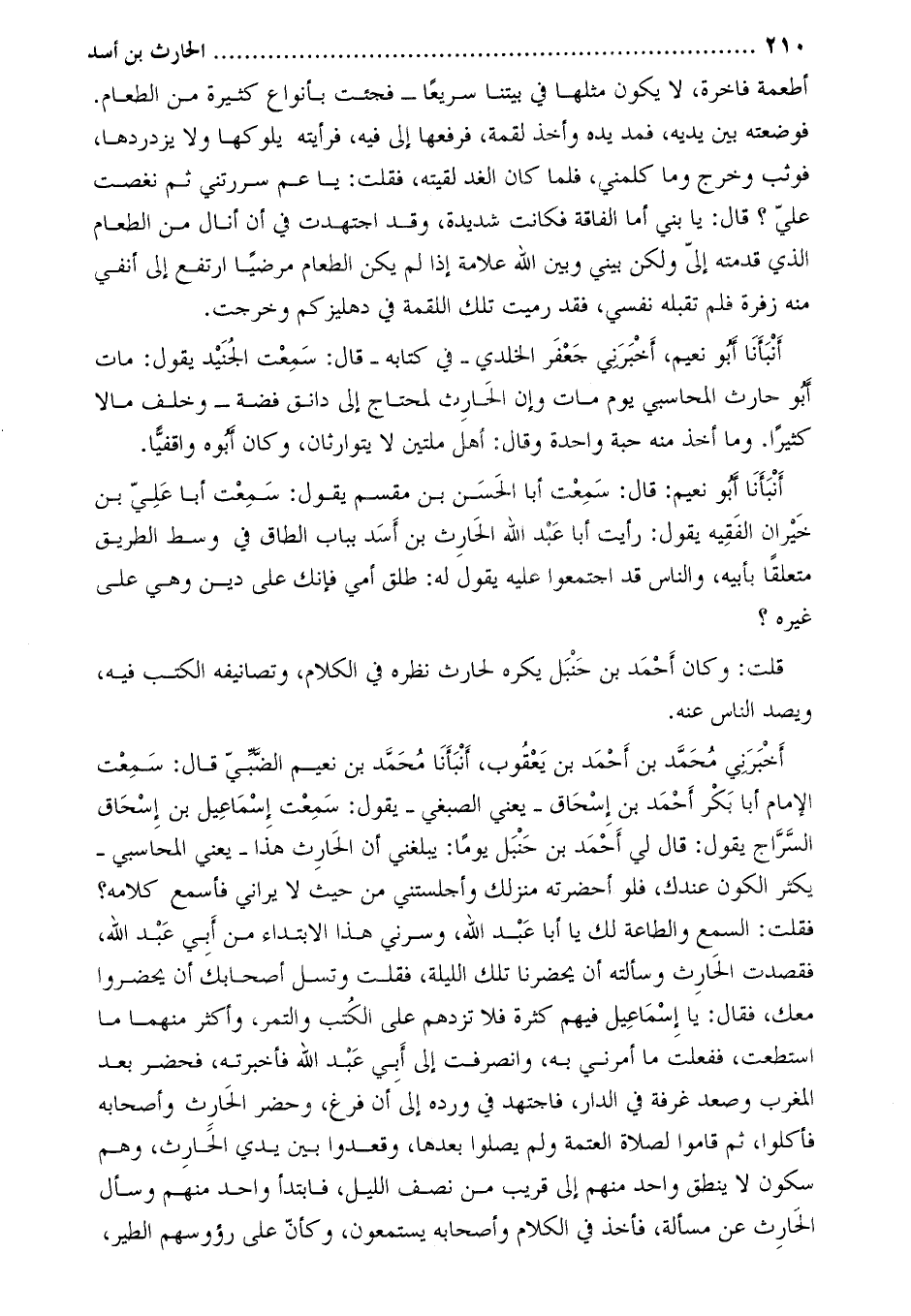 قلت: وَكَانَ أَحْمَد بْن حَنْبَل يكره لحارث نظره فِي الكلام، وَتصانيفه الكتب فيه، وَيصد الناس عَنْهُ.