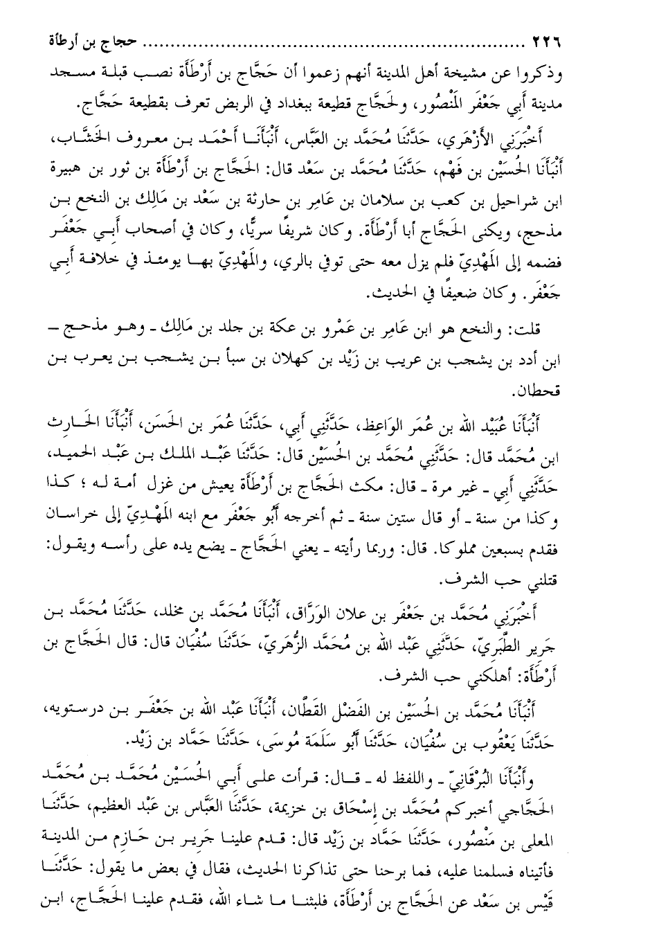 أَخْبَرَنِي الأزهري، حدّثنا محمّد بن العبّاس، أنبأنا أحمد بن معروف الخشّاب، أنبأنا الْحُسَيْن بْن فهم، حَدَّثَنَا مُحَمَّد بْن سَعْد قَالَ: الحجاج بْن أرطأة بن ثور بن هبيرة ابن شراحيل بْن كعب بْن سلامان بْن عامر بْن حارثة بْن سَعْد بْن مَالِك بْن النخع بن مذحج، وَيكنى الحجاج أبا أرطاة. وَكَانَ شريفا سريا، وَكَانَ فِي أصحاب أَبِي جَعْفَر فضمه إِلَى المهدي فلم يزل معه حتى توفي بالري، وَالمهدي بها يومئذ فِي خلافة أَبِي جَعْفَر. وَكَانَ ضعيفا فِي الحديث.
