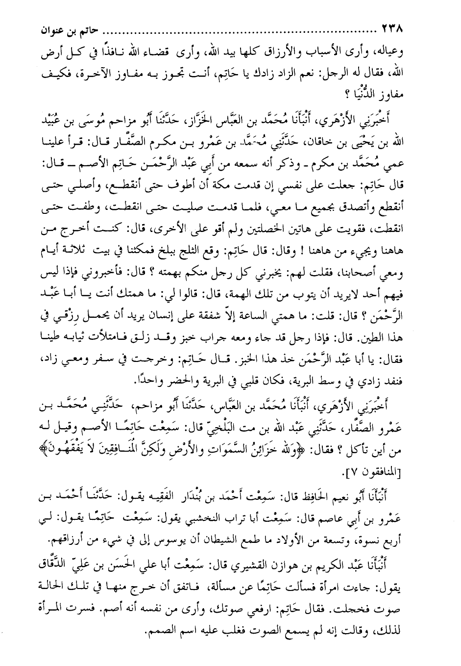 أخبرني الأزهري، أنبأنا محمّد بن العبّاس الخزّاز، حَدَّثَنَا أَبُو مزاحم مُوسَى بْن عُبَيْد اللَّه بن يحيى بن خاقان، حَدَّثَنِي مُحَمَّد بْن عَمْرو بْن مكرم الصفار قَالَ: قرأ علينا عمي مُحَمَّد بْن مكرم- وَذكر أنه سمعه من أَبِي عَبْد الرَّحْمَنِ حاتم الأصم- قَالَ: