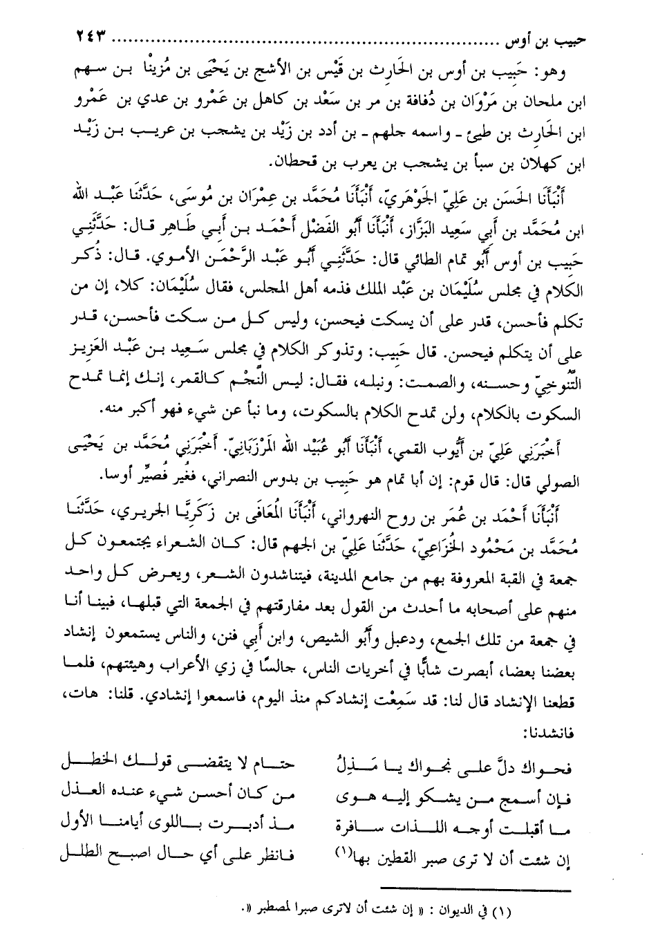 أنبأنا الحسن بن عليّ الجوهريّ، أنبأنا محمّد بن عمران بن موسى، حدّثنا عبد الله ابن محمّد بن أبي سعيد البزّاز، أنبأنا أَبُو الفضل أَحْمَد بْن أَبِي طاهر قَالَ: حَدَّثَنِي حبيب بْن أوس أَبُو تمام الطائي قَالَ: حَدَّثَنِي أَبُو عَبْد الرَّحْمَنِ الأموي. قَالَ: ذكر الكلام فِي مجلس سُلَيْمَان بْن عَبْد الملك فذمه أَهْل المجلس، فَقَالَ سُلَيْمَان: كلا، إن من تكلم فأحسن، قدر على أن يسكت فيحسن، وَليس كل من سكت فأحسن، قدر على أن يتكلم فيحسن. قَالَ حبيب: وَتُذُوكِرَ الكلام فِي مجلس سعيد بْن عَبْد العزيز التنوخي وَحسنه، وَالصمت: وَنبله، فَقَالَ: ليس النجم كالقمر، إنك إنما تمدح السكوت بالكلام، وَلن تمدح الكلام بالسكوت، وَما نَبَّأَ عَنْ شيء فهو أكبر منه.