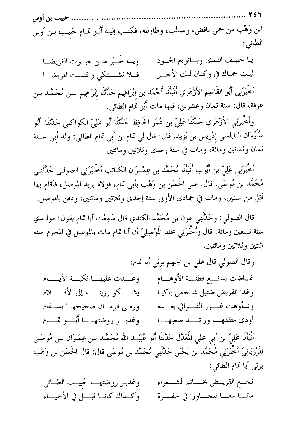أنبأنا عليّ بن أبي علي المعدّل حَدَّثَنَا أَبُو عُبَيْد الله مُحَمَّد بْن عمران بن موسى المرزبانيّ أخبرني محمّد بن يحيى حَدَّثَنِي مُحَمَّد بْن مُوسَى قَالَ: قَالَ الْحَسَن بْن وَهب يرثي أبا تمام الطائي: