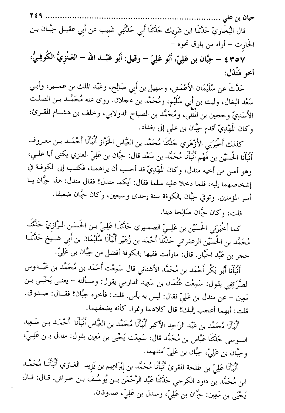 أنبأنا محمّد بن عبد الواحد الأكبر أنبأنا محمّد بن العبّاس أنبأنا أحمد بن سعيد السوسي حَدَّثَنَا عباس بن محمد قَالَ: سمعت يحيى بْن معين يقول: مندل بْن علي، وَحبان بن عليّ، حبّان بن عليّ أمثلهما.