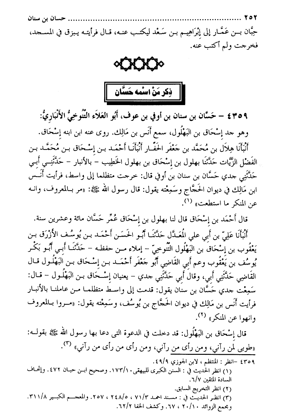 أَنْبَأَنَا هِلالُ بْنُ مُحَمَّدِ بْنِ جَعْفَرٍ الْحَفَّارُ أنبأنا أَحْمَدُ بْنُ إِسْحَاقَ بْنِ مُحَمَّدِ بْنِ الْفَضْلِ الزّيّات حَدَّثَنَا بُهْلُولُ بْنُ إِسْحَاقَ بْنِ بُهْلُولٍ الْخَطِيبُ- بالأنبار- حدّثني أبي حَدَّثَنِي جَدِّي حَسَّانُ بْنُ سِنَانِ بْنِ أَوْفَى قَالَ: خَرَجْتُ مُتَظَلِّمًا إِلَى وَاسِطَ، فَرَأَيْتُ أَنَسَ ابن مَالِكٍ فِي دِيوَانِ الْحَجَّاجِ وَسَمِعْتُهُ يَقُولُ: قَالَ رَسُولُ اللَّهِ صَلَّى اللَّهُ عَلَيْهِ وَسَلَّمَ: «مر بِالْمَعْرُوفِ، وَانْهَ عَنِ الْمُنْكَرِ مَا اسْتَطَعْتَ» [2]