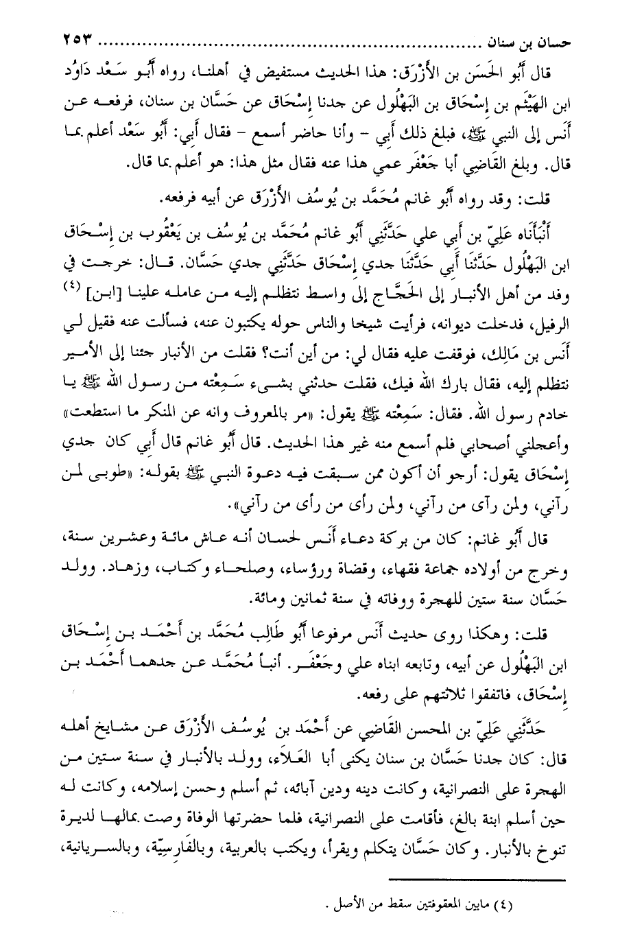 أنبأناه عليّ بن أبي علي حَدَّثَنِي أَبُو غَانِمٍ مُحَمَّدُ بْنُ يُوسُفَ بْنِ يَعْقُوبَ بن إسحاق ابن البهلول حدّثنا أبي حدّثنا جدي إسحاق حَدَّثَنِي جَدِّي حَسَّانٌ. قَالَ: خَرَجْتُ فِي وَفْدٍ مِنْ أَهْلِ الأَنْبَارِ إِلَى الْحَجَّاجِ إِلَى وَاسِطَ نَتَظَلَّمُ إِلَيْهِ مِنْ عَامِلِهِ عَلَيْنَا [ابْنَ] [1] الرَّفِيلِ، فَدَخَلْتُ دِيوَانَهُ، فَرَأَيْتُ شَيْخًا وَالنَّاسُ حَوْلَهُ يَكْتُبُونَ عَنْهُ، فَسَأَلْتُ عَنْهُ فَقِيلَ لِي أَنَسُ بْنُ مَالِكٍ، فَوَقَفْتُ عَلَيْهِ فَقَالَ لِي: مِنْ أَيْنَ أَنْتَ؟ فَقُلْتُ مِنَ الأَنْبَارِ جِئْنَا إِلَى الأَمِيرِ نَتَظَلَّمُ إِلَيْهِ، فَقَالَ بَارَكَ اللَّهُ فِيكَ، فَقُلْتُ حَدِّثْنِي بِشَيْءٍ سَمِعْتَهُ مِنْ رَسُولِ اللَّهِ صَلَّى اللَّهُ عَلَيْهِ وَسَلَّمَ يَا خَادِمَ رَسُولِ اللَّهِ. فَقَالَ: سَمِعْتُهُ صَلَّى اللَّهُ عَلَيْهِ وَسَلَّمَ يَقُولُ: «مُرْ بِالْمَعْرُوفِ وَانْهَ عَنِ الْمُنْكَرِ مَا اسْتَطَعْتَ»
