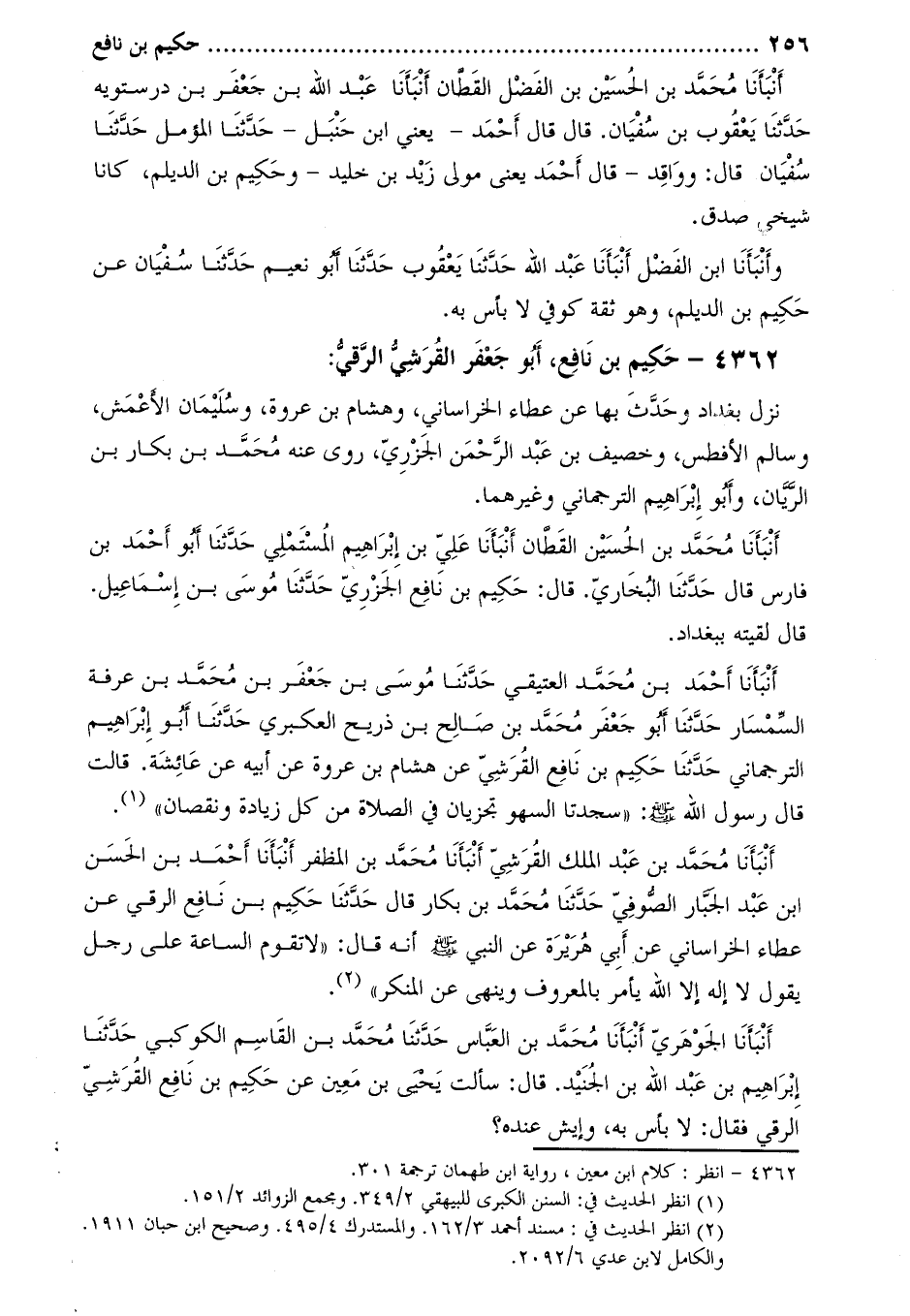 . أنبأنا الجوهريّ أنبأنا محمّد بن العبّاس حدّثنا محمّد بن القاسم الكوكبي حدثنا إبراهيم بن عبد الله بن الجنيد. قَالَ: سألت يَحْيَى بْن معين عَنْ حكيم بْن نافع القرشي الرَّقِّيّ فَقَالَ: لا بأس به، وأيش عنده؟