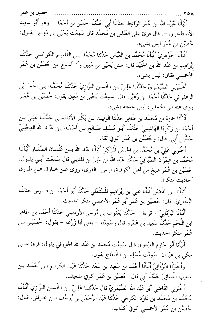 أنبأنا حمزة بن محمّد بن طاهر حدّثنا الوليد بن بكر الأندلسي حدثنا علي بن أحمد بن زكريا الهاشمي حدثنا أبو مسلم صالح بن أحمد بن عبد الله العجليّ حَدَّثَنِي أَبِي. قَالَ: وَحصين بْن عُمَر كوفي ثقة.