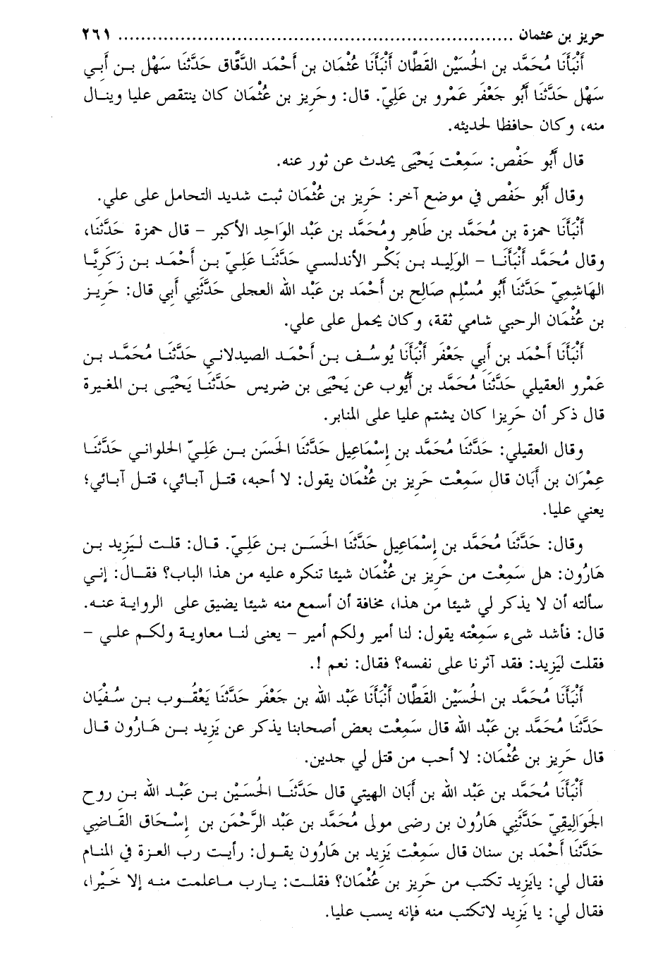 أنبأنا محمّد بن الحسين القطّان أنبأنا عثمان بن أحمد الدّقّاق حدّثنا سهل بن أبي سهل حدّثنا أبو جعفر عَمْرو بْن علي. قَالَ: وَحريز بْن عُثْمَان كَانَ ينتقص عليا وَينال منه، وَكَانَ حافظا لحديثه.