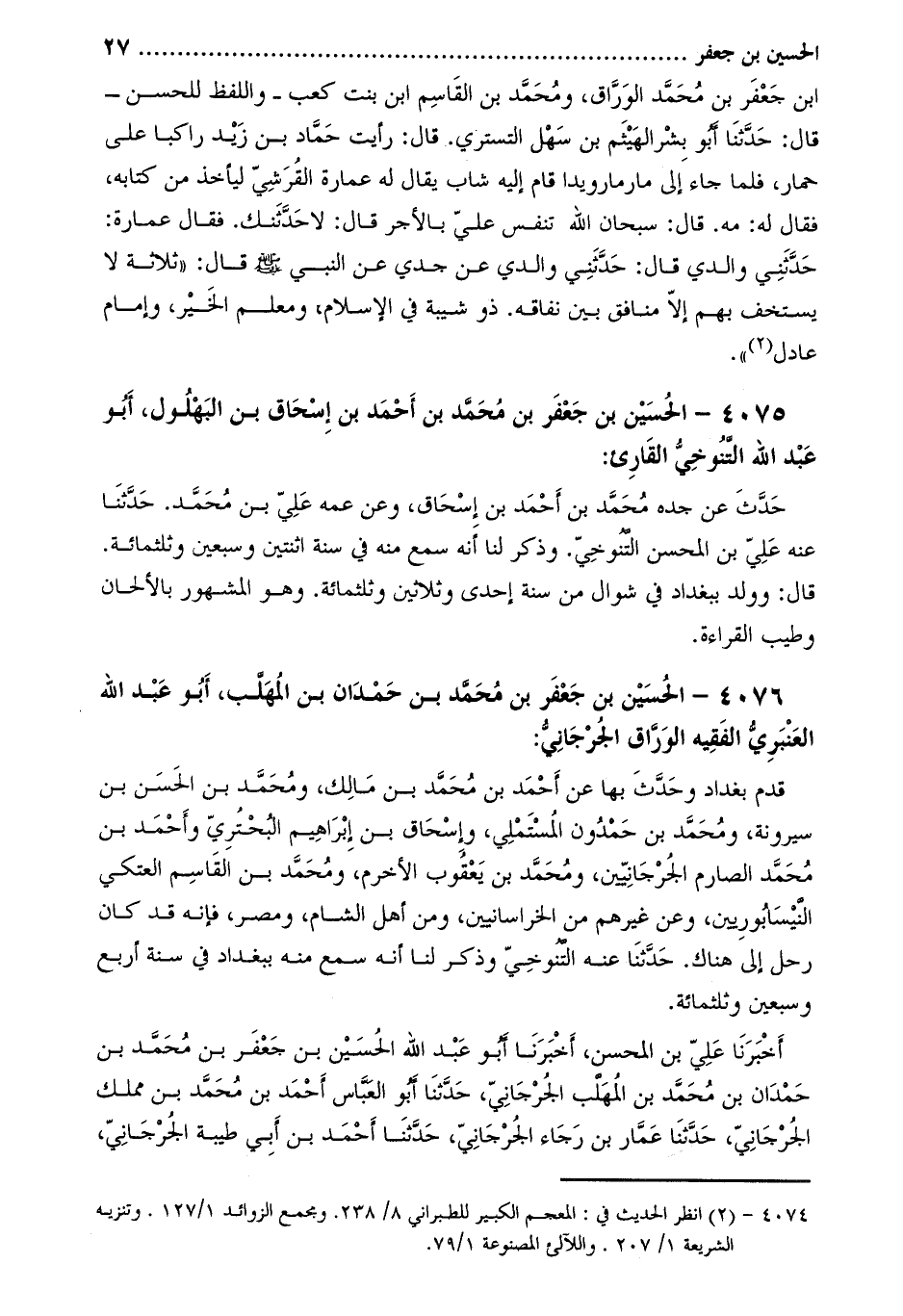 . 4075- الْحُسَيْن بْن جَعْفَر بْن مُحَمَّد بْن أَحْمَدَ بْن إِسْحَاق بْن البهلول، أَبُو عَبْدِ اللَّهِ التنوخي القارئ:
