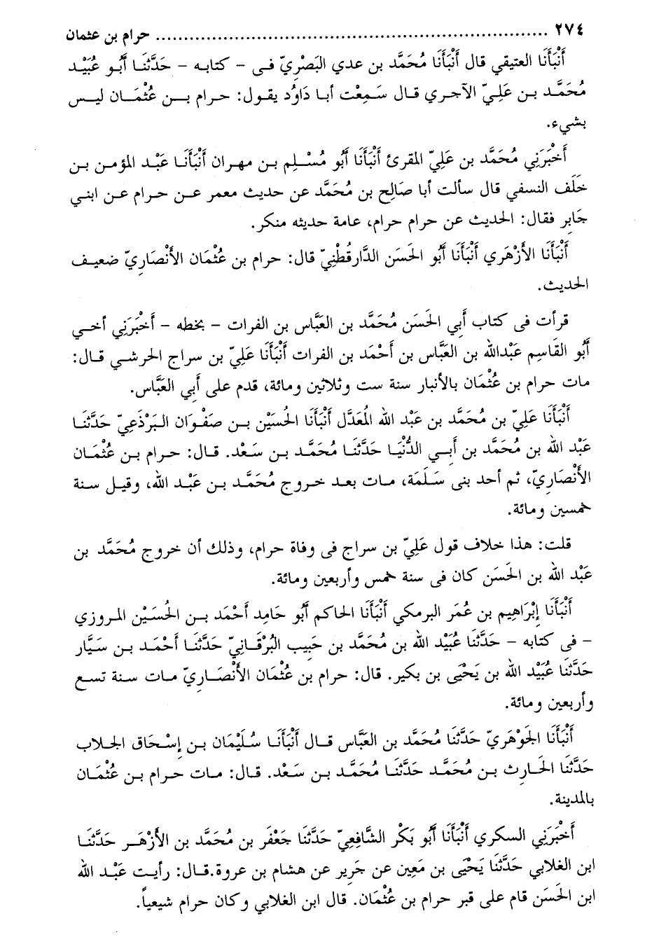 أنبأنا الجوهريّ حدّثنا محمّد بن العبّاس قال أنبأنا سليمان بن إسحاق الجلاب حدّثنا الحارث بن محمّد حَدَّثَنَا مُحَمَّد بْن سَعْد. قَالَ: مات حرام بن عثمان بالمدينة.