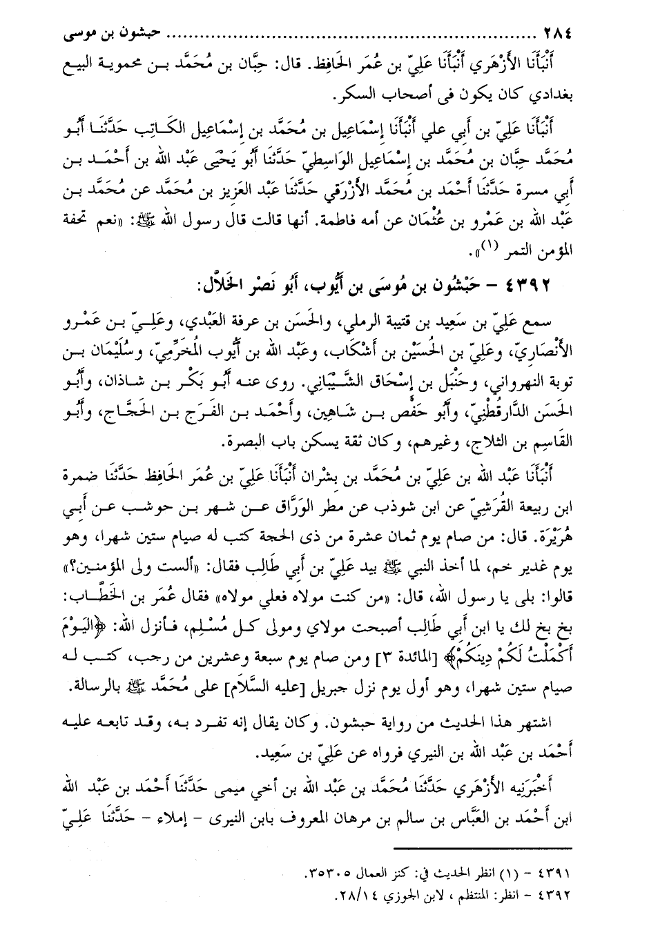 أنبأنا عَبْدُ اللَّهِ بْنُ عَلِيِّ بْنِ مُحَمَّدِ بْنِ بشران أنبأنا عليّ بن عمر الحافظ حدّثنا ضمرة ابن رَبِيعَةَ الْقُرَشِيُّ عَنِ ابْنِ شَوْذَبٍ عَنْ مَطَرٍ الْوَرَّاقِ عَنْ شَهْرِ بْنِ حَوْشَبٍ عَنْ أَبِي هُرَيْرَةَ. قَالَ: مَنْ صَامَ يَوْمَ ثَمَانِ عَشْرَةَ مِنْ ذِي الْحِجَّةِ كُتِبَ لَهُ صِيَامُ سِتِّينَ شَهْرًا، وَهُوَ يَوْمُ غَدِيرِ خُمٍّ، لَمَّا أَخَذَ النَّبِيُّ صَلَّى اللَّهُ عَلَيْهِ وَسَلَّمَ بِيَدِ عَلِيِّ بْنِ أَبِي طَالِبٍ فَقَالَ: «أَلَسْتُ وَلِيُّ الْمُؤْمِنِينَ؟» قَالُوا: بَلَى يا رَسُولَ اللَّهِ، قَالَ: «مَنْ كُنْتُ مَولاهُ فَعَلِيٌّ مَوْلاهُ» فَقَالَ عُمَرُ بْنُ الخطّاب: