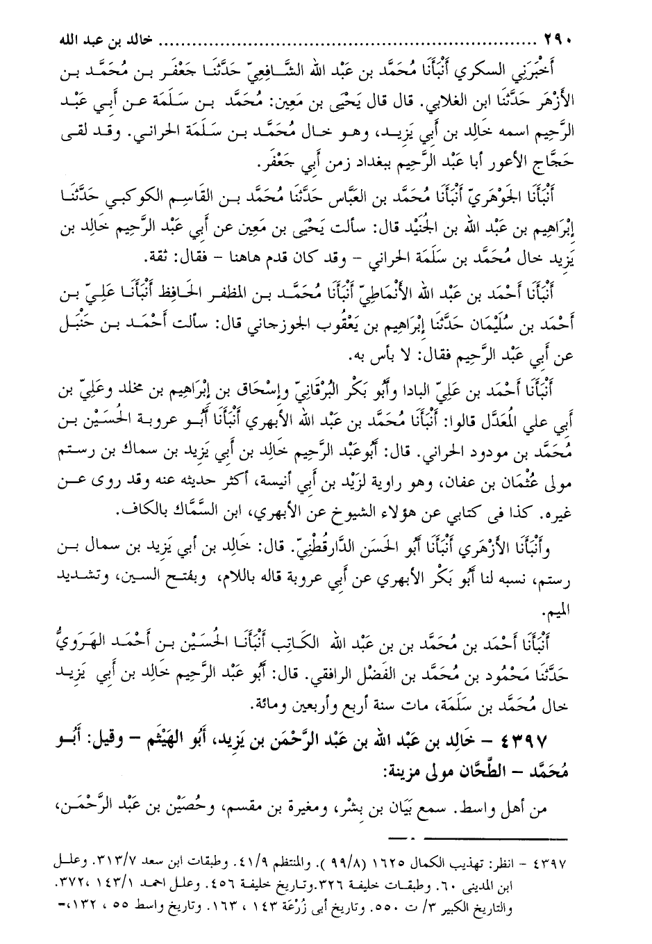 أَنْبَأَنَا أَحْمَد بْن عَلِيّ البادا وَأَبُو بَكْر البرقاني وَإسحاق بْن إِبْرَاهِيمَ بْن مخلد وَعلي بْن أَبِي علي المعدّل قالوا: أنبأنا محمّد بن عبد الله الأبهري أنبأنا أَبُو عَرُوبَةَ الْحُسَيْنُ بْنُ مُحَمَّدِ بْنِ مَوْدُودٍ الْحَرَّانِيُّ. قَالَ: أَبُو عَبْد الرحيم خَالِد بْن أَبِي يزيد بْن سماك بْن رستم مولى عثمان بن عفان، وهو راوية لزيد بْن أَبِي أنيسة، أكثر حديثه عنه وَقد روى عَنْ غيره. كذا فِي كتابي عَنْ هؤلاء الشيوخ عَنِ الأبهري، ابْن السماك بالكاف.