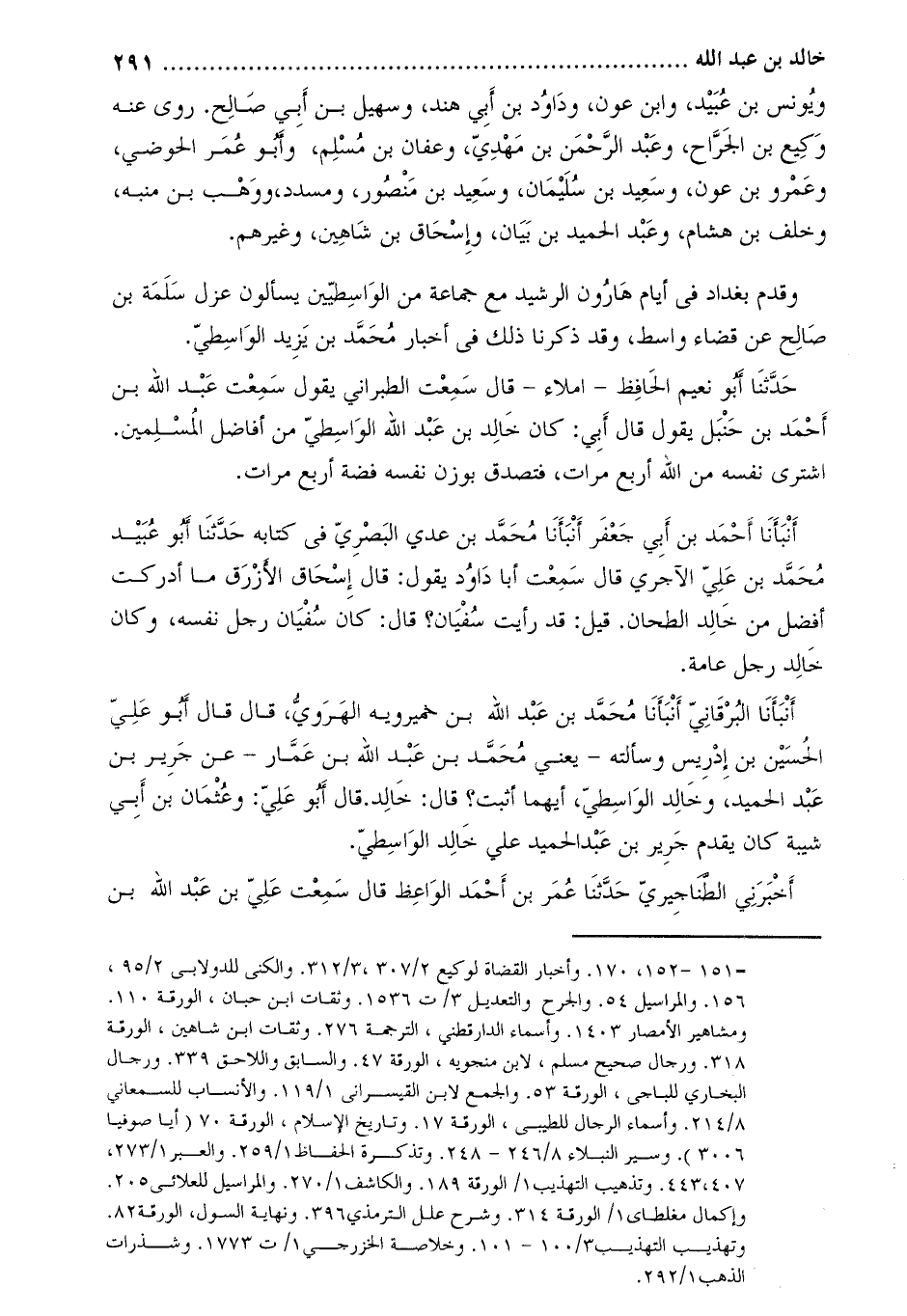 حَدَّثَنَا أَبُو نعيم الْحَافِظ- إملاء- قَالَ سمعت الطَّبَرَانِيّ يقول سمعت عَبْد اللَّهِ بْن أَحْمَد بْن حَنْبَل يقول قَالَ أَبِي: كَانَ خَالِد بْن عَبْد اللَّهِ الواسطي من أفاضل المسلمين.