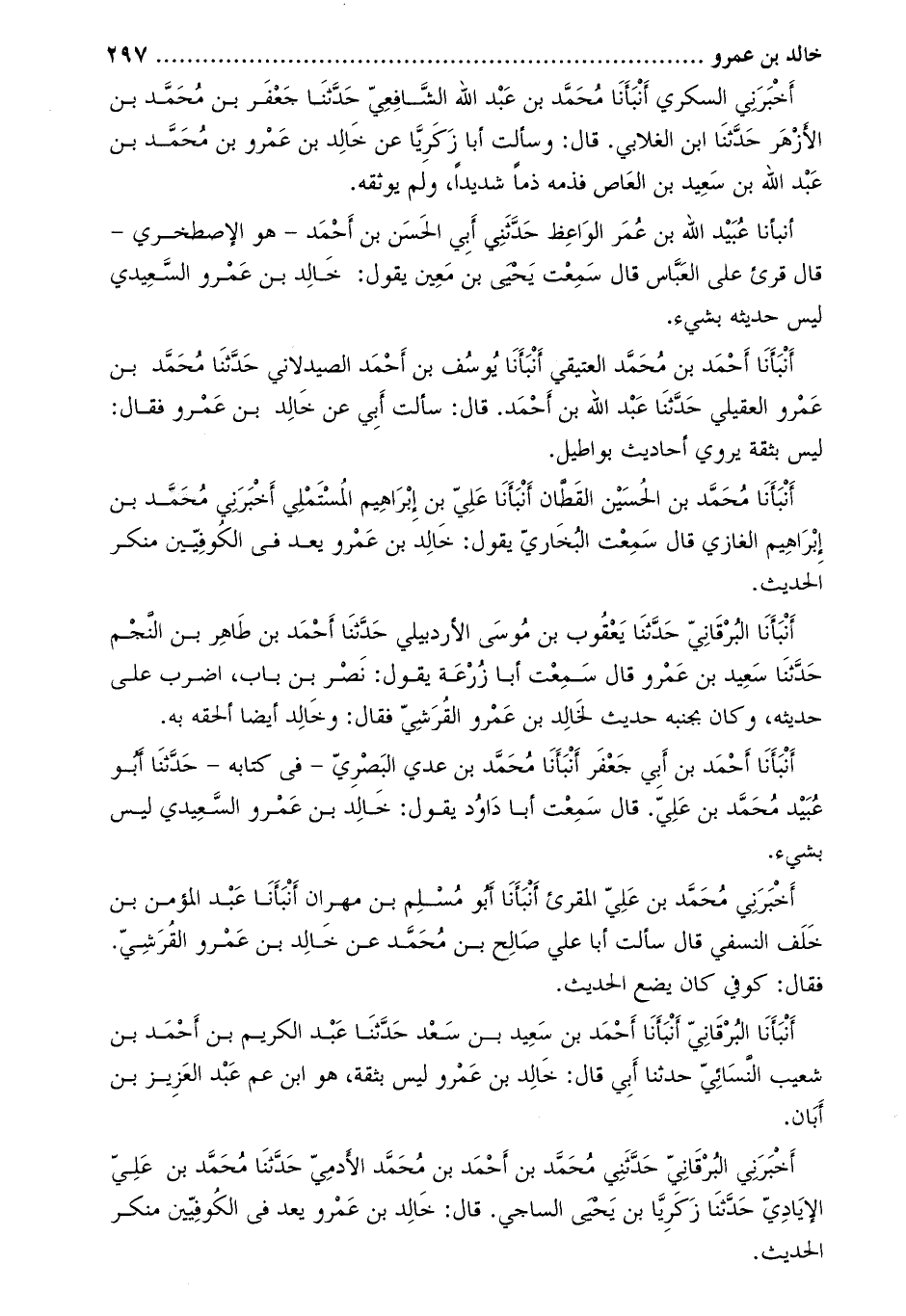 أنبأنا أحمد بن محمّد العتيقي أنبأنا يوسف بن أحمد الصيدلاني حدّثنا محمّد بن عمرو العقيلي حَدَّثَنَا عبد الله بن أحمد. قَالَ: سألت أَبِي عَنْ خَالِد بْن عَمْرو فَقَالَ: