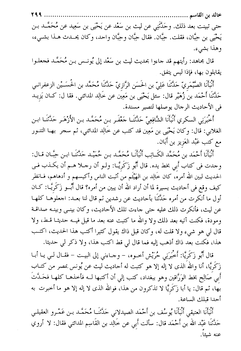 أنبأنا الصّيمريّ حدّثنا عليّ بن الحسن الرّازيّ حدّثنا محمّد بن الحسين الزعفراني حَدَّثَنَا أحمد بن زهير قَالَ: سئل يحيى بْن معين عَنْ خَالِد المدائني. فَقَالَ: كَانَ يزيد فِي الأحاديث الرجال يوصلها لتصير مسندة.