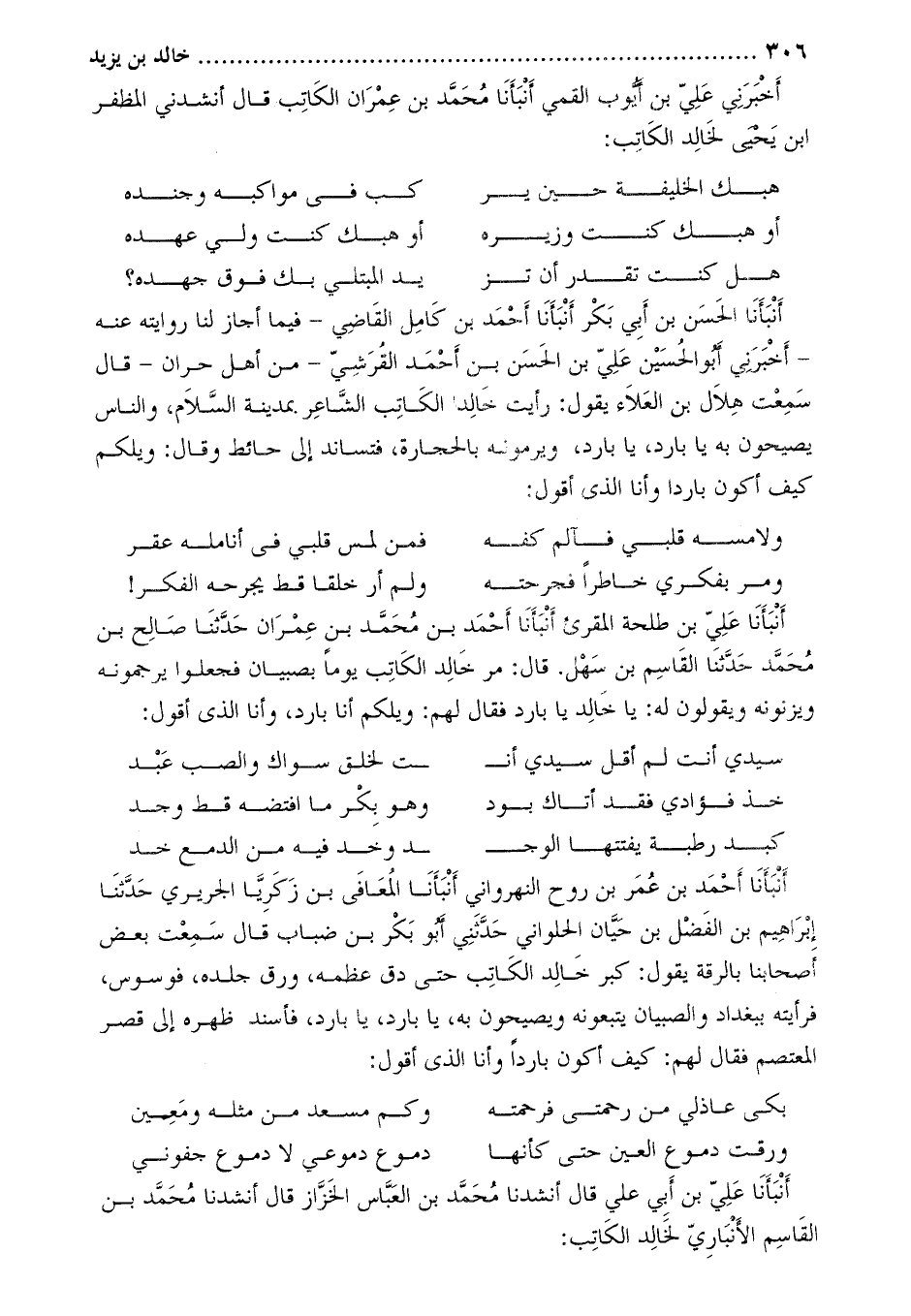 أنبأنا علي بْن أَبِي علي قَالَ أنشدنا مُحَمَّد بْن الْعَبَّاس الخزاز قَالَ أنشدنا مُحَمَّد بْن الْقَاسِم الأَنْبَارِيّ لخالد الكاتب: