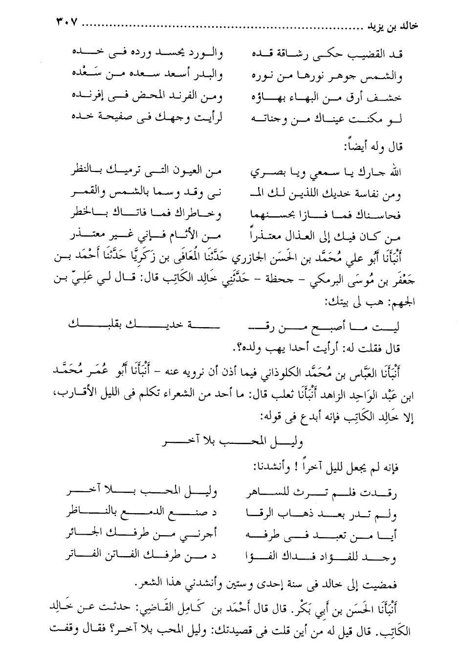 أنبأنا الْحَسَن بْن أَبِي بَكْر. قَالَ قَالَ أَحْمَد بْن كامل الْقَاضِي: حدثت عَنْ خَالِد الكاتب. قَالَ قيل له من أين قلت فِي قصيدتك: وَليل المحب بلا آخر؟ فَقَالَ وَقفت