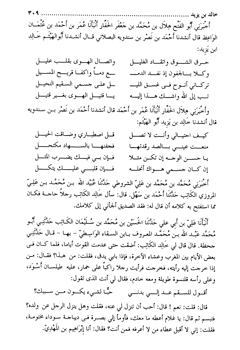 أَخْبَرَنِي أَبُو الْفَتْحِ هِلالُ بْنُ مُحَمَّدِ بْنِ جَعْفَرٍ الْحَفَّارُ أنبأنا عُمَرُ بْنُ أَحْمَدَ بْنِ عُثْمَانَ الْوَاعِظُ قَالَ أنشدنا أَحْمَد بْن نصر بْن سندويه البصلاني قال أنشدنا أبو الهيثم خالد ابن يزيد: