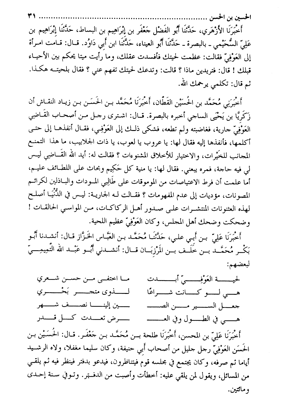 أخبرني محمّد بن الحسين القطّان، أَخْبَرَنَا مُحَمَّد بْن الْحَسَن بْن زياد النقاش أن زكريا بن يَحْيَى الساجي أخبره بالبصرة. قَالَ: اشترى رجل من أصحاب الْقَاضِي العوفي جارية، فغاضبته ولم تطعه، فشكى ذلك إِلَى العوفي، فَقَالَ أنفذها إلي حتى أكلمها، فأنفذها إليه فَقَالَ لها: يا عروب يا لعوب، يا ذات الجلابيب، ما هذا التمنع المجانب للخيرات، والاختيار للأخلاق المشنوءات؟ فَقَالَتْ لَهُ: أيد اللَّه الْقَاضِي ليس لِي فيه حاجة، فمره يبعني. فَقَالَ لها: يا منية كل حكيم وبحاث عَلَى اللطائف عليم، أما علمت أن فرط الاعتياصات من الموموقات عَلَى طالبي المودات والباذلين لكرائم المصونات، مؤديات إِلَى عدم المفهومات؟ فَقَالَتْ لَهُ الجارية: ليس فِي الدنيا أصلح لهذه العثنونات المنتشرات عَلَى صدور أهل الركاكات، من المواسي الحالقات! وضحكت وضحك أهل المجلس، وكان العوفي عظيم اللحية.