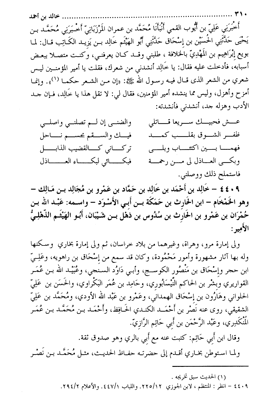 4409- خَالِد بْن أَحْمَد بْن خَالِد بْن حَمَّاد بْن عَمْرو بْن مجالد بن مالك- وهو الخمخام- ابن الحارث بن حكمة بْن أَبِي الأسود- وَاسمه: عَبْد اللَّهِ بْن حمران بْن عَمْرو بْن الحارث بْن سدوس بن ذهل بن شيبان، أَبُو الهيثم الذهلي الأمير [2] :