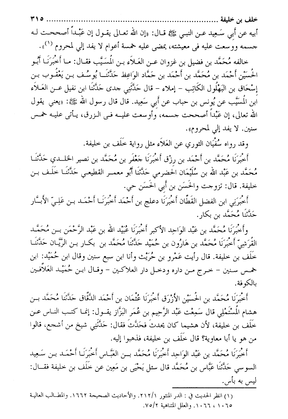 مُحَمَّدُ بْنُ فُضَيْلِ بْنِ غَزْوَانَ عَنِ الْعَلاءِ بْنِ الْمُسَيِّبِ فقال: ما أَخْبَرَنَا أَبُو الْحُسَيْنِ أَحْمَدُ بْنُ مُحَمَّدِ بْنِ أحمد بن حمّاد الواعظ حَدَّثَنَا يُوسُفُ بْنُ يَعْقُوبَ بْنِ إِسْحَاقَ بْنِ البهلول الكاتب- إملاء- قال حدّثني جدي حدّثنا ابن نفيل عن العلاء ابن المسيّب عن يونس بن حباب عَنْ أَبِي سَعِيدٍ. قَالَ قَالَ رَسُولُ اللَّهِ صَلَّى اللَّهُ عَلَيْهِ وَسَلَّمَ: «يَعْنِي يَقُولُ اللَّهُ تَعَالَى، إِنَّ عَبْدًا أَصْحَحْتُ جِسْمَهُ، وَأَوْسَعْتُ عَلَيْهِ في الزرق، يَأْتِي عَلَيْهِ خَمْسُ سِنِينَ. لا يَفِدُ إِلَيَّ لَمَحْرُومٌ»