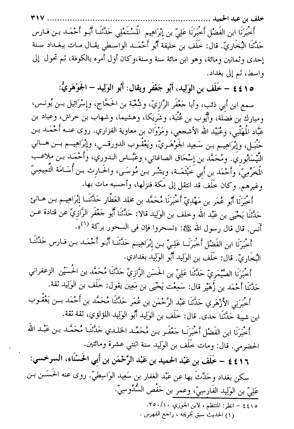 . أَخْبَرَنَا ابْن الفضل أخبرنا عليّ بن إبراهيم حدّثنا أبو أحمد بن فارس حَدَّثَنَا الْبُخَارِيّ. قَالَ: خلف بْن الوليد أَبُو الوليد بغدادي.