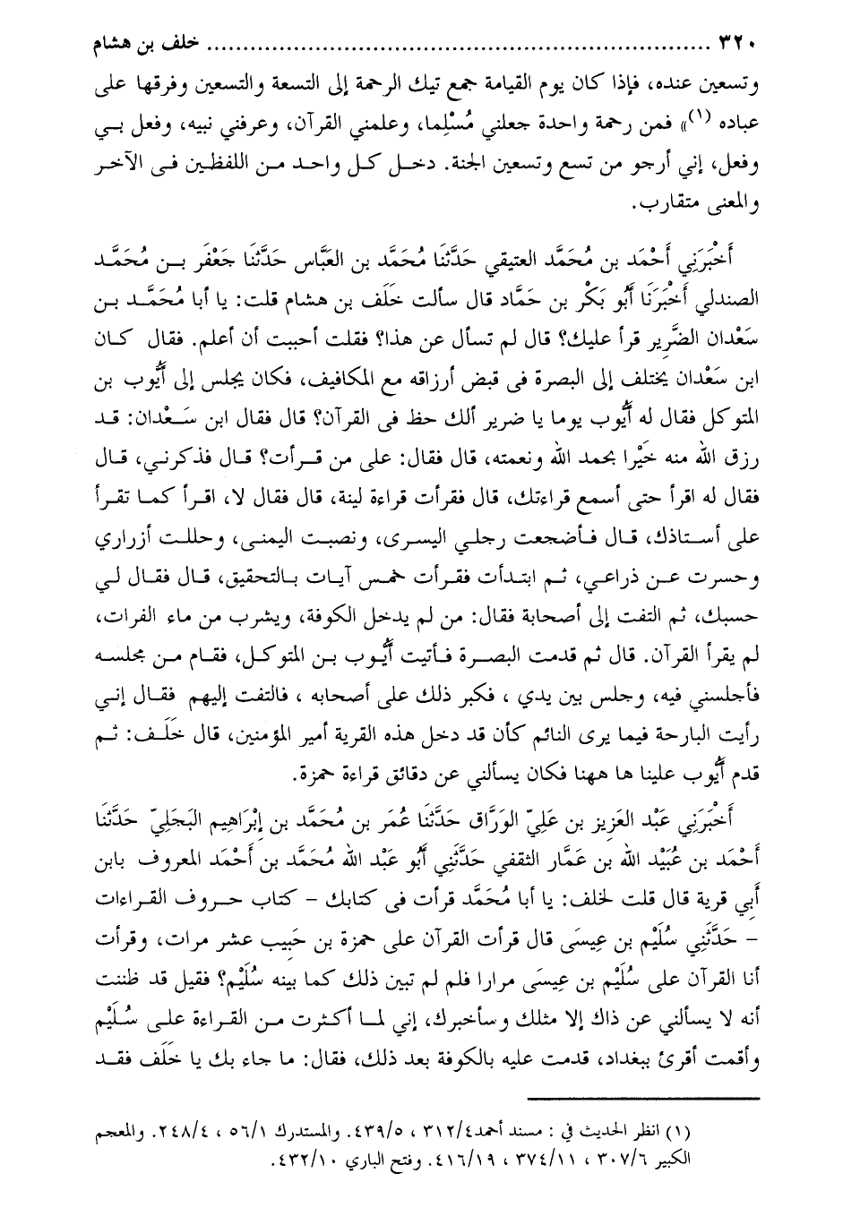 أخبرني أحمد بن محمّد العتيقي حدّثنا محمّد بن العبّاس حدّثنا جعفر بن محمّد الصندلي أَخْبَرَنَا أَبُو بَكْر بْن حَمَّاد قَالَ سألت خلف بْن هِشَام قلت: يا أبا مُحَمَّد بْن سعدان الضرير قرأ عليك؟ قَالَ لم تسأل عَنْ هذا؟ فقلت أحببت أن أعلم. فَقَالَ كَانَ ابْن سعدان يختلف إِلَى الْبَصْرَة فِي قبض أرزاقه مَعَ المكافيف، فكان يجلس إِلَى أَيُّوب بْن المتوكل فَقَالَ له أَيُّوب يوما يا ضرير ألك حظ فِي القرآن؟ قَالَ فَقَالَ ابْن سعدان: قد رزق اللَّه منه خيرا بحمد اللَّه وَنعمته، قَالَ فَقَالَ: على من قرأت؟ قَالَ فذكرني، قَالَ فَقَالَ له اقرأ حَتَّى أسمع قراءتك، قَالَ فقرأت قراءة لينة، قَالَ فَقَالَ لا، اقرأ كما تقرأ على أستاذك، قَالَ فأضجعت رجلي اليسرى، وَنصبت اليمنى، وَحللت أزراري وَحسرت عَنْ ذراعي، ثُمَّ ابتدأت فقرأت خمس آيات بالتحقيق، قَالَ فَقَالَ لي حسبك، ثُمَّ التفت إِلَى أصحابه فَقَالَ: من لم يدخل الكوفة، وَيشرب من ماء الفرات، لم يقرأ القرآن. قَالَ ثُمَّ قدمت الْبَصْرَة فأتيت أَيُّوب بْن المتوكل، فقام من مجلسه فأجلسني فيه، وَجلس بين يدي، فكبر ذلك على أصحابه، فالتفت إليهم فَقَالَ إني رأيت البارحة فيما يرى النائم كأن قد دخل هذه القرية أمير المؤمنين، قَالَ خلف: ثُمَّ قدم أَيُّوب علينا هاهنا فكان يسألني عَنْ دقائق قراءة حمزة.