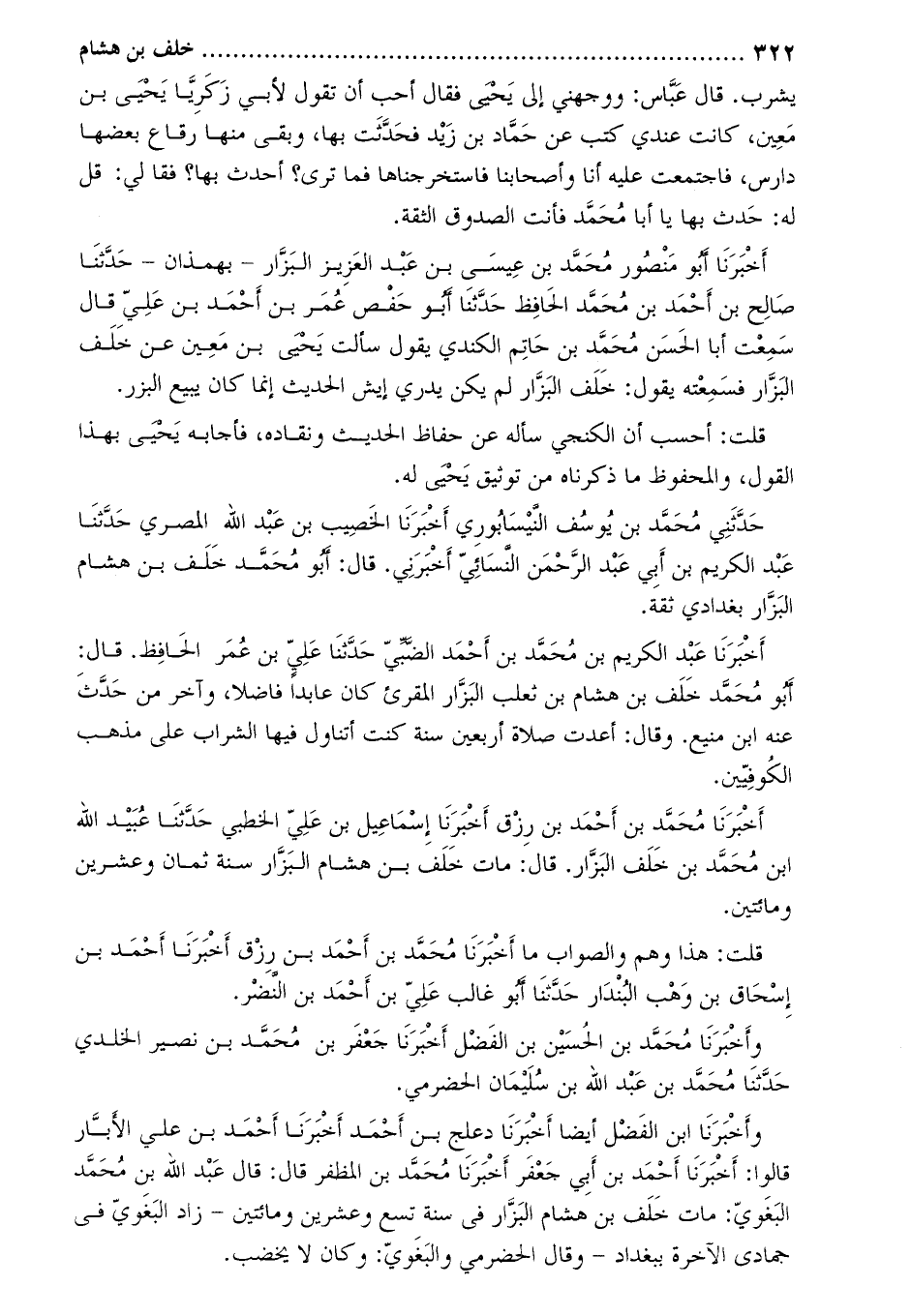 حَدَّثَنِي محمد بن يوسف النيسابوري أخبرنا الخصيب بن عبد الله المصري حدثنا عبد الكريم بن أبي عبد الرحمن النّسائيّ أخبرني. قَالَ: أَبُو مُحَمَّد خلف بْن هِشَام البزار بغدادي ثقة.