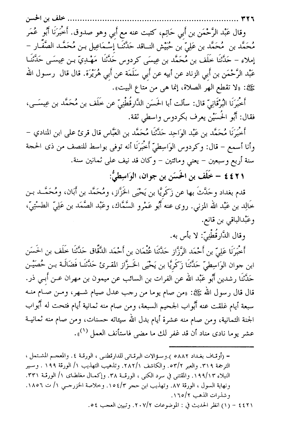 - (أوقاف بغداد 5882) . وسؤالات البرقاني للدارقطنى، الورقة 4. والمعجم المشتمل، الترجمة 319. والعبر 2/53. والكاشف 1/282. وتذهيب التهذيب 1/الورقة 199. وسير النبلاء 13/199. والمقتنى في سرد الكنى، الورقة 38. وإكمال مغلطاي 1/الورقة 331.