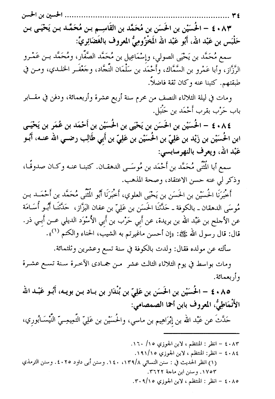 4084- الْحُسَيْن بن الْحَسَن بْن يَحْيَى بْن الْحُسَيْن بْن أَحْمَدَ بْنِ عُمَر بن يحيى ابن الْحُسَيْن بْن زيد بْن عَلِيّ بْن الْحُسَيْن بن عَلِيّ بْن أَبِي طالب رضي اللَّه عنه، أبو عبد الله، ويعرف بالنهرسابسي [2] :