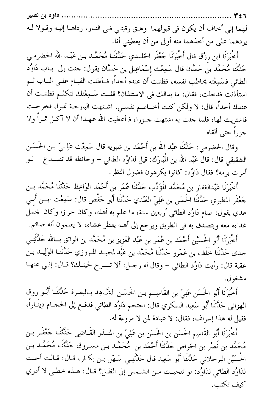وَقَالَ الحضرمي: حَدَّثَنَا عَبْد اللَّه بْن أَحْمَد بْن شَبَّوَيْهِ قَالَ سمعت عَلِيّ بْن الْحَسَن الشقيقي قَالَ: قَالَ عَبْد اللَّهِ بْن المبارك: قيل لداود الطائي- وَحائطه قد تصدع- لو أمرت برمه؟ فَقَالَ داود: كانوا يكرهون فضول النظر.
