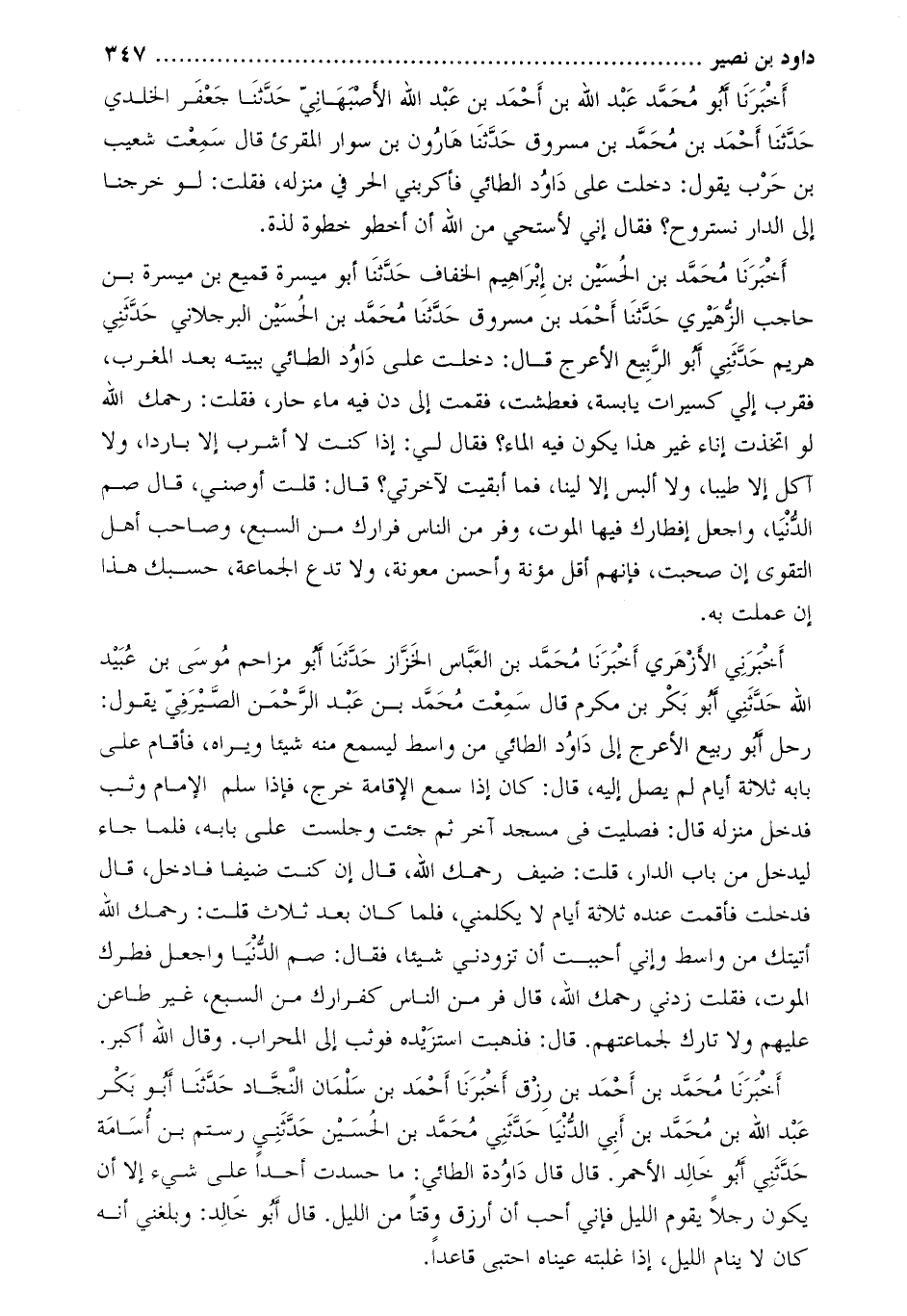 أَخْبَرَنَا مُحَمَّد بْن أَحْمَد بْن رزق أخبرنا أحمد بن سلمان النّجّاد حَدَّثَنَا أَبُو بَكْرٍ عَبْدُ اللَّهِ بْنُ مُحَمَّدِ بْنِ أبي الدّنيا حدّثني محمّد بن الحسين حدّثني رستم بن أسامة حَدَّثَنِي أَبُو خَالِد الأحمر. قَالَ قَالَ داود الطائي: ما حسدت أحدا على شيء إِلا أن يَكُون رجلا يقوم الليل فإني أحب أن أرزق وَقتا من الليل. قَالَ أَبُو خَالِد: وَبلغني أنه كَانَ لا ينام الليل، إذا غلبته عيناه احتبى قاعدا.
