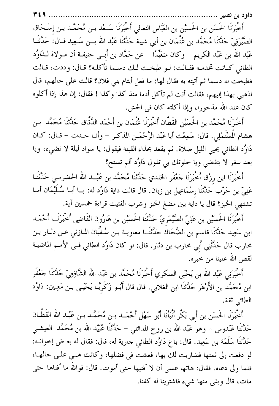 أخبرنا الحسن بن الحسين بن العباس النعالي أَخْبَرَنَا سَعْدُ بْنُ مُحَمَّدِ بْنِ إِسْحَاقَ الصَّيْرَفِيُّ حدثنا محمد بن عثمان بن أبي شيبة حَدَّثَنَا عَبْد اللَّهِ بْنُ سَعِيدٍ قَالَ: حَدَّثَنَا عَبْدُ اللَّهِ بْنُ عَبْد الكريم- وَكَانَ متعبدا- عَنْ حَمَّاد بْن أَبِي حنيفة أن مولاة لداود الطائي كانت تخدمه فقالت: لو طبخت لك دسما تأكله؟ قَالَ: وَددت، قالت فطبخت له دسما ثُمَّ أتيته به فَقَالَ لها: ما فعل أيتام بني فلان؟ قالت على حالهم، قَالَ اذهبي بهذا إليهم، فقالت أنت لم تأكل آدما منذ كذا وَكذا! فَقَالَ: إن هذا إذا أكلوه كَانَ عند اللَّه مذخورا، وَإذا أكلته كَانَ فِي الحش.