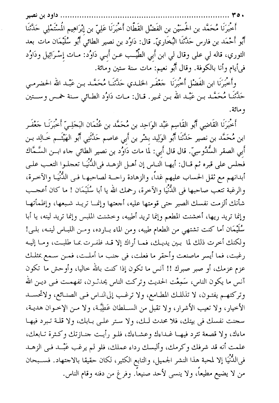 أَخْبَرَنَا الْقَاضِي أَبُو الْقَاسِمِ عَبْدُ الْوَاحِدِ بْنُ محمد بن عثمان البجليّ أخبرنا جعفر ابن محمّد بن نصير حَدَّثَنَا أَبُو الوليد بشر بْن أَبِي عاصم حَدَّثَنِي أَبُو الهيثم خَالِد بْن أَبِي الصقر السدوسي. قَالَ قَالَ أَبِي: لما مات داود بْن نصير الطائي جاء ابْن السماك فجلس على قبره ثُمَّ قَالَ: أيها الناس إن أهل الزهد في الدّنيا تعجلوا التعب على أبدانهم مع ثقل الحساب عليهم غدا، وَالزهادة راحة لصاحبها فِي الدنيا وَالآخرة، وَالرغبة تتعب صاحبها فِي الدنيا وَالآخرة، رحمك اللَّه يا أبا سُلَيْمَان! ما كَانَ أعجب شأنك ألزمت نفسك الصبر حَتَّى قومتها عَلَيْهِ، أجعتها وَإنما تريد شبعها، وَأظمأتها وَإنما تريد ريها، أخشنت المطعم وَإنما تريد أطيبه، وَخشنت الملبس وَإنما تريد لينه، يا أبا سُلَيْمَان أما كنت تشتهي من الطعام طيبة، وَمن الماء بارده، وَمن اللباس لينه، بلى! وَلكنك أخرت ذلك لما بين يديك، فما أراك إِلا قد ظفرت بما طلبت، وَما إليه رغبت، فما أيسر ما صنعت وَأحقر ما فعلت، فِي جنب ما أملت، فمن سمع بمثلك عزم عزمك، أَوْ صبر صبرك!! آنس ما تكون إذا كنت بالله خاليا، وَأوحش ما تكون آنس ما يَكُون الناس، سمعت الحديث وَتركت الناس يحدثون، تفهمت في دين الله وتركتهم يفتون، لا تذللك المطامع، وَلا ترغب إِلَى الناس فِي الصنائع، وَلا تحسد الأخيار، وَلا تعيب الأشرار، وَلا تقبل من السلطان عطية، وَلا من الإخوان هدية، سجنت نفسك فِي بيتك، فلا محدث لك، وَلا ستر على بابك، وَلا قلة تبرد فيها ماءك، وَلا قصعة تثرد فيها غداءك وَعشاءك، فلو رأيت جنازتك وَكثرة تابعك، علمت أنه قد شرفك وَكرمك، وَألبسك رداء عملك، فلو لم يرغب عَبْد فِي الزهد فِي الدنيا إِلا لمحبة هذا النشر الجميل، وَالتابع الكثير، لكان حقيقا بالاجتهاد. فسبحان من لا يضيع مطيعا، وَلا ينسى لأحد صنيعا. وَفرغ من دفنه وقام الناس.