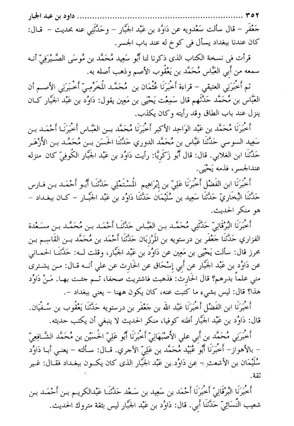 ثُمَّ أَخْبَرَنِي العتيقي- قراءة أخبرنا عثمان بن محمّد المخرّميّ أَخْبَرَنِي الأصم أنّ الْعَبَّاس بْن مُحَمَّد حدثهم قَالَ سمعت يَحْيَى بْن معين يقول: داود بْن عَبْد الجبار كَانَ ينزل عند باب الطاق وَقد رأيته وَكَانَ يكذب.