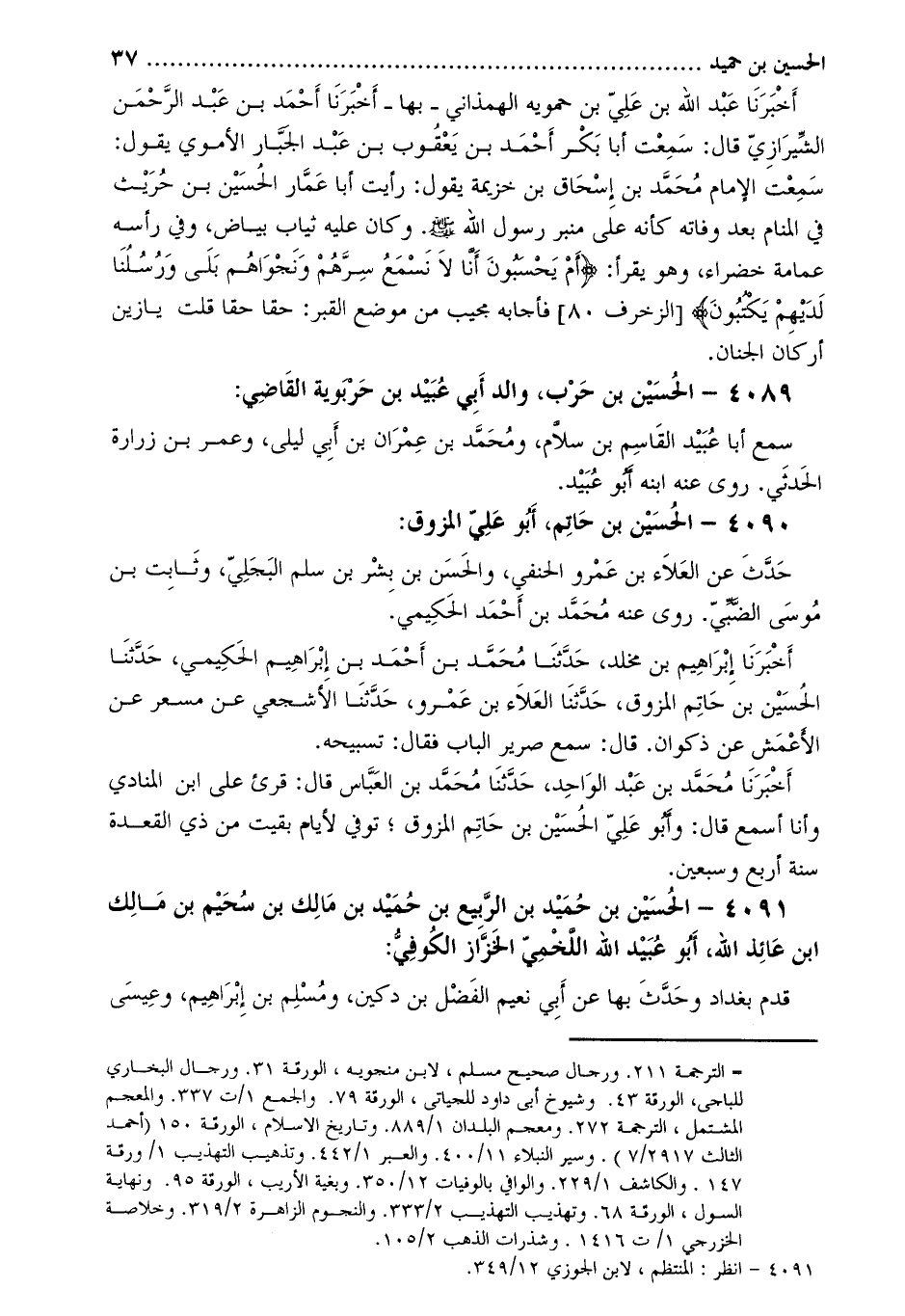 4091- الْحُسَيْن بن حميد بن الربيع بن حميد بن مالك بن سحيم بن مالك ابن عائذ اللَّه، أَبُو عُبَيْد اللَّهِ اللخمي الخزاز الكُوفِيّ [1] :