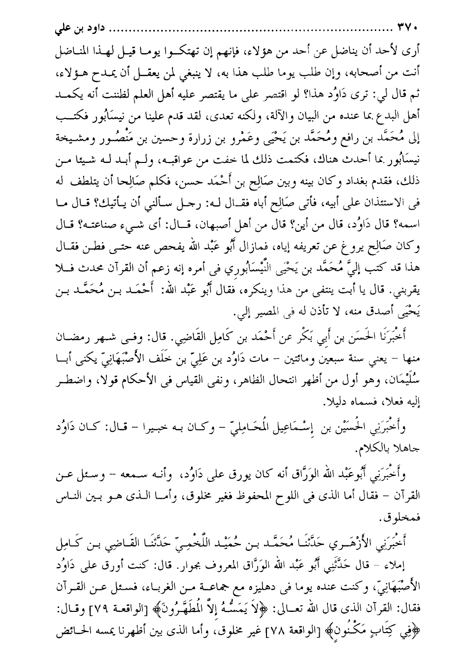 أَخْبَرَنِي الأزهري حدّثنا محمّد بن حميد اللّخميّ حدّثنا القاضي بن كامل إملاء- قَالَ حَدَّثَنِي أَبُو عَبْد اللَّهِ الورّاق المعروف بجوار. قَالَ: كنت أورق على دَاوُد الأَصْبَهَانِيّ، وَكنت عنده يوما فِي دهليزه مَعَ جماعة من الغرباء، فسئل عَنِ القرآن فَقَالَ: القرآن الَّذِي قَالَ اللَّه تعالى: لا يَمَسُّهُ إِلَّا الْمُطَهَّرُونَ
