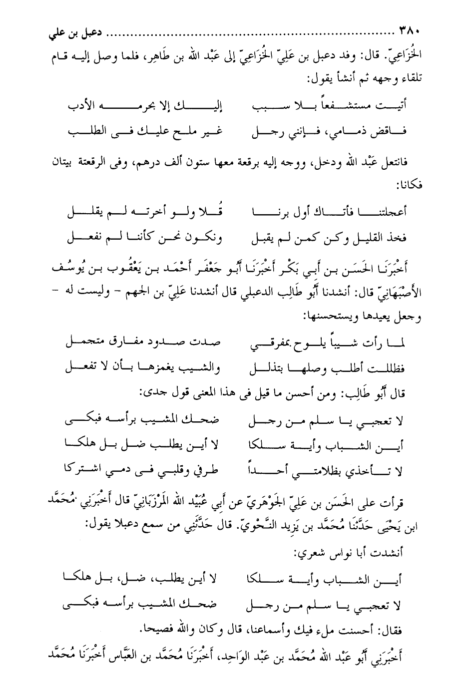 قرأت على الْحَسَن بْن عَلِيّ الجوهري عَنْ أَبِي عُبَيْد اللَّهِ المرزباني قَالَ أَخْبَرَنِي مُحَمَّد ابن يحيى حَدَّثَنَا مُحَمَّد بْن يَزِيد النحوي. قَالَ حَدَّثَنِي من سمع دعبلا يقول: