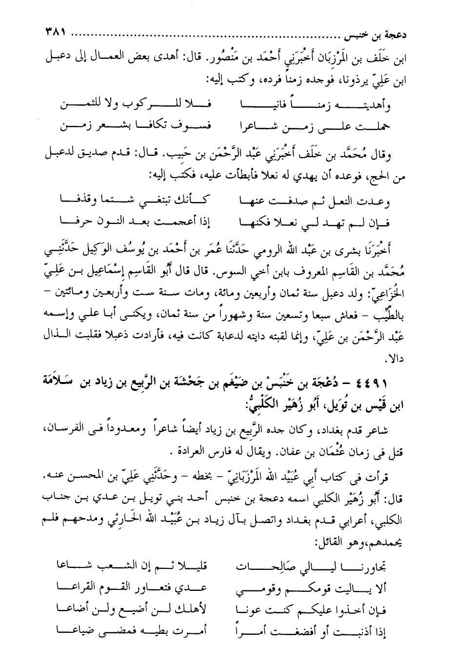 قَالَ: أَبُو زهير الكلبي اسمه دعجة بْن خنبس أحد بني تويل بْن عدي بْن جناب الكلبي، أعرابي قدم بَغْدَاد وَاتصل بآل زِيَاد بْن عُبَيْد اللَّهِ الحارثي وَمدحهم فلم يحمدهم، وهو القائل: