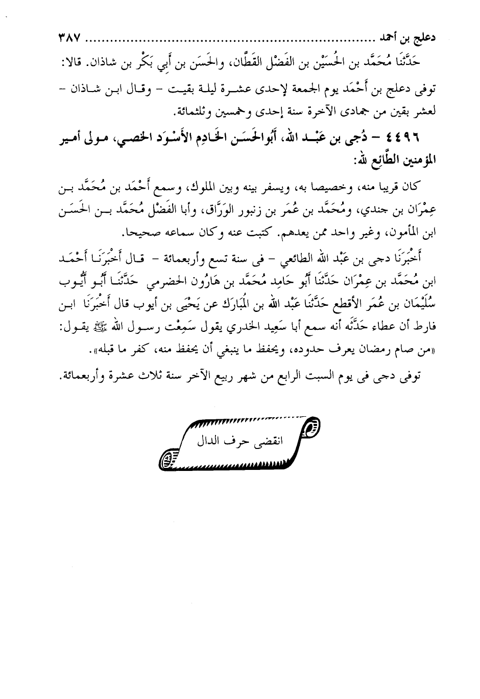 4496- دجى بْن عَبْد اللَّهِ، أَبُو الْحَسَن الخادم الأسود الخصي، مولى أمير المؤمنين الطائع لله: