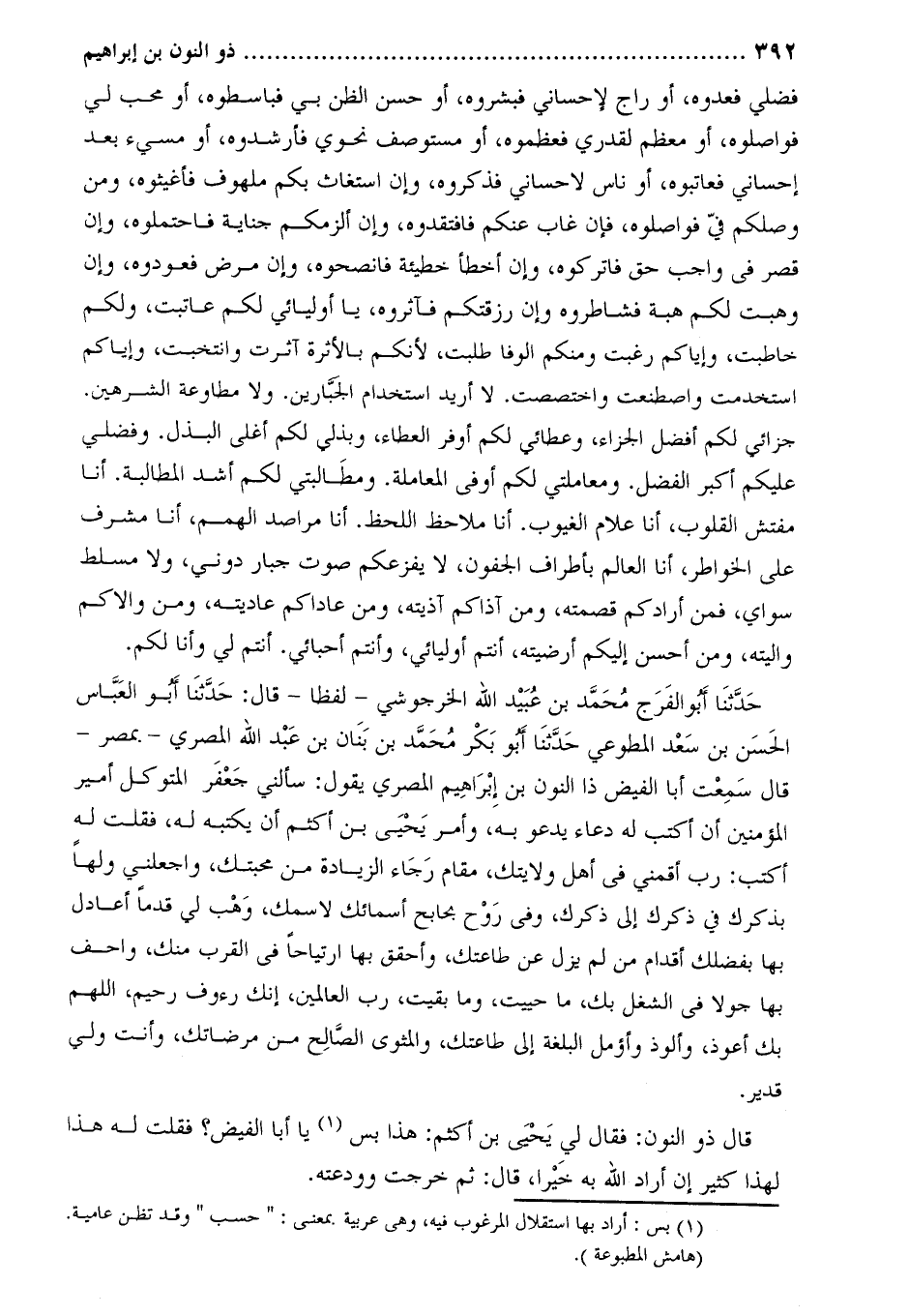 حَدَّثَنَا أَبُو الْفَرَجِ مُحَمَّدُ بْنُ عُبَيْدِ اللَّهِ الْخَرْجُوشِيُّ- لَفْظًا- قَالَ: حَدَّثَنَا أَبُو الْعَبَّاسِ الْحَسَنُ بْن سعد المطوعي حَدَّثَنَا أَبُو بَكْر مُحَمَّد بْن بنان بْن عَبْد اللَّهِ المصري- بمصر- قَالَ سمعت أبا الفيض ذا النون بْن إِبْرَاهِيمَ المصري يقول: سألني جَعْفَر المتوكل أمير المؤمنين أن أكتب له دعاء يدعو به، وَأمر يَحْيَى بْن أكثم أن يكتبه له، فقلت له اكتب: رب أقمني فِي أَهْل وَلايتك، مقام رجاء الزيادة من محبتك، وَاجعلني وَلها بذكرك فِي ذكرك إِلَى ذكرك، وَفي روح بحابح أسمائك لاسمك، وهب إلي قدما أعادل بها بفضلك أقدام من لم يزل عَنْ طاعتك، وَأحقق بها ارتياحا فِي القرب منك، واحف بها جولا فِي الشغل بك، ما حييت، وَما بقيت، رب العالمين، إنك رءوف رحيم، اللهم بك أعوذ، وَألوذ وَأؤمل البلغة إِلَى طاعتك، وَالمثوى الصالح من مرضاتك، وَأنت وَلي قدير.