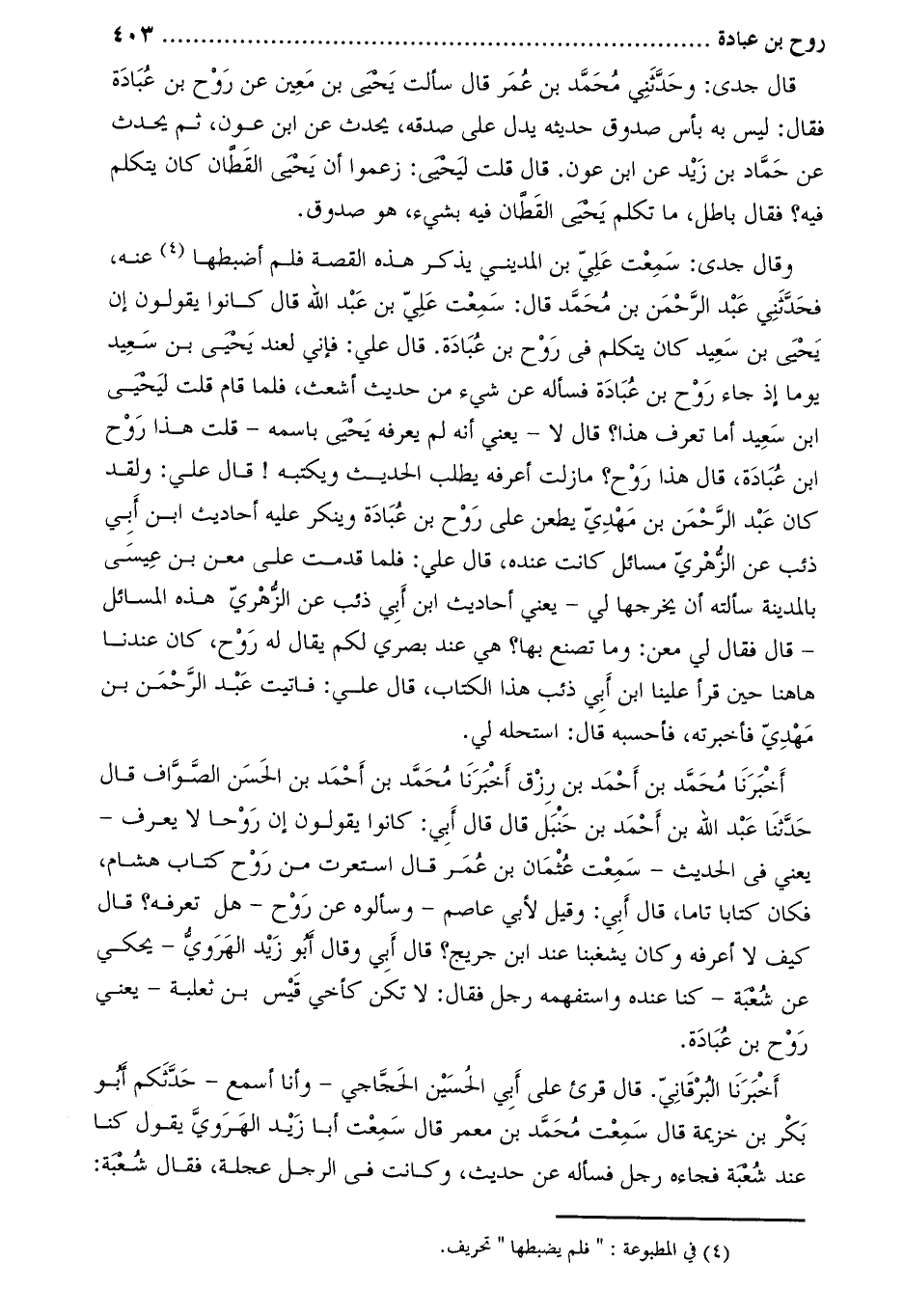 أَخْبَرَنَا مُحَمَّدُ بْنُ أَحْمَدَ بْنِ رِزْقٍ أخبرنا محمد بن أحمد بن الحسن الصواف قال حدثنا عَبْد اللَّه بْن أَحْمَد بْن حَنْبَل قَالَ قَالَ أَبِي: كانوا يقولون إن روحا لا يعرف- يعني فِي الحديث- سمعت عُثْمَان بْن عُمَر قَالَ استعرت من روح كتاب هِشَام، فكان كتابا تاما، قَالَ أَبِي: وقيل لأبي عاصم- وسألوه عَنْ روح- هل تعرفه؟ قَالَ كيف لا أعرفه وَكَانَ يشغبنا عند ابْن جريج؟ قَالَ أَبِي وَقَالَ أَبُو زيد الهروي- يحكي عَنْ شعبة- كنا عنده وَاستفهمه رجل فَقَالَ: لا تكن كأخي قيس بْن ثعلبة- يعني روح بْن عبادة.